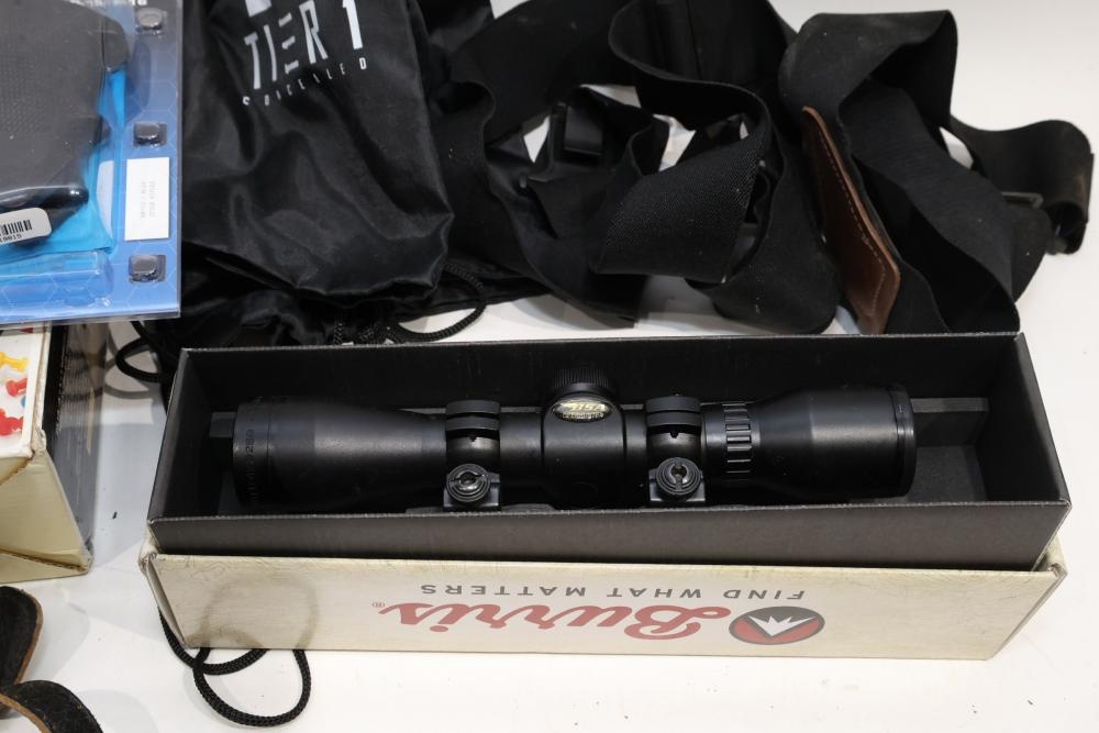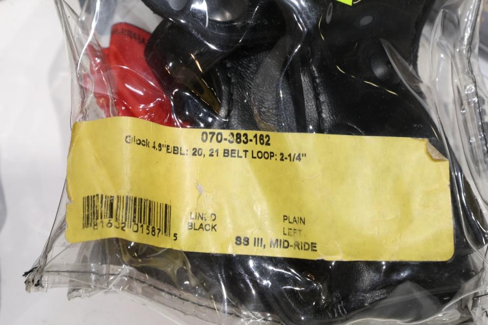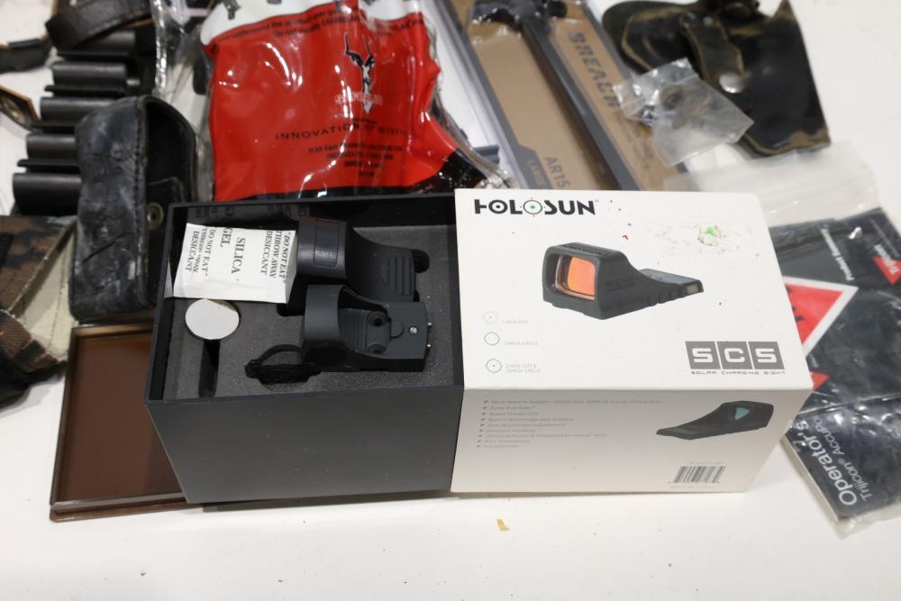 Assorted firearm accessories including a Safariland holster marked “070-383-162” for Glock 20/21, an Aero AR15/M4E1 charging handle, a Holosun SCS optic, and a BSA Deerhunter scope, with various additional pouches, mounts, and gear (other model numbers not visible). All lots are subject to all applicable laws at the time of transfer. NOTE: Semi automatic rifles and all handguns require a license in NYS. There is a $35 transfer fee per long gun. There is a $40 transfer fee per hand gun. There is a $20 transfer fee per ammunition lot. If you fail the background check, the transfer fee still applies, and you are still required to make payment and then reconsign the lot to auction. FFL dealers are not exempt from these fees. A background check will be required for all buyers purchasing a firearm and/or ammunition. NYS charges a background check fee for all firearms and ammunition. The fee is $9 for firearms and $2.50 for ammunition. The NYS fee is per background check NOT per lot, will be collected directly by Civil Armory, and is in addition to any transfer All lots are subject to all applicable laws at the time of transfer. NOTE: Semi automatic rifles and all handguns require a license in NYS. There is a $35 transfer fee per long gun. There is a $40 transfer fee per hand gun. There is a $20 transfer fee per ammunition lot. If you fail the background check, the transfer fee still applies, and you are still required to make payment and then reconsign the lot to auction. FFL dealers are not exempt from these fees. A background check will be required for all buyers purchasing a firearm and/or ammunition. NYS charges a background check fee for all firearms and ammunition. The fee is $9 for firearms and $2.50 for ammunition. The NYS fee is per background check NOT per lot, will be collected directly by Civil Armory, and is in addition to any transfer