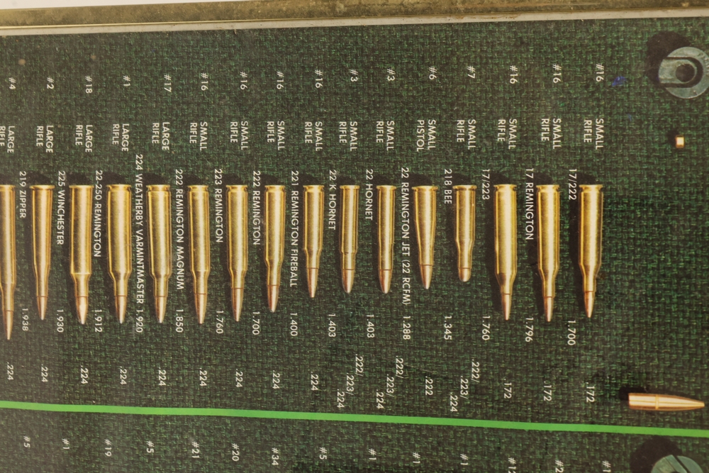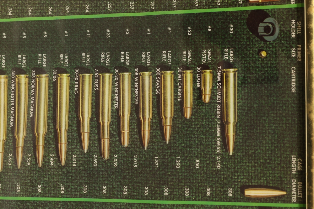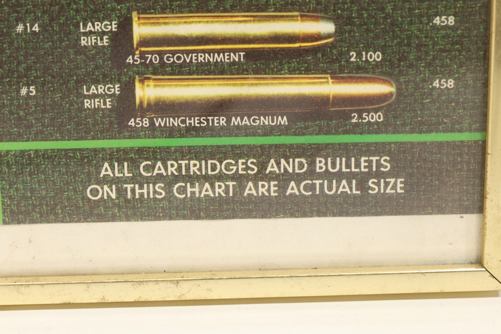 Framed cartridge identification chart displaying actual-size illustrations and nomenclature for a wide range of rifle and pistol cartridges, with labeled dimensions and cartridge names, housed in a metal frame. All lots are subject to all applicable laws at the time of transfer. NOTE: Semi automatic rifles and all handguns require a license in NYS. There is a $35 transfer fee per long gun. There is a $40 transfer fee per hand gun. There is a $20 transfer fee per ammunition lot. If you fail the background check, the transfer fee still applies, and you are still required to make payment and then reconsign the lot to auction. FFL dealers are not exempt from these fees. A background check will be required for all buyers purchasing a firearm and/or ammunition. NYS charges a background check fee for all firearms and ammunition. The fee is $9 for firearms and $2.50 for ammunition. The NYS fee is per background check NOT per lot, will be collected directly by Civil Armory, and is in addition to transfer fees.