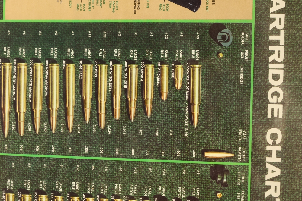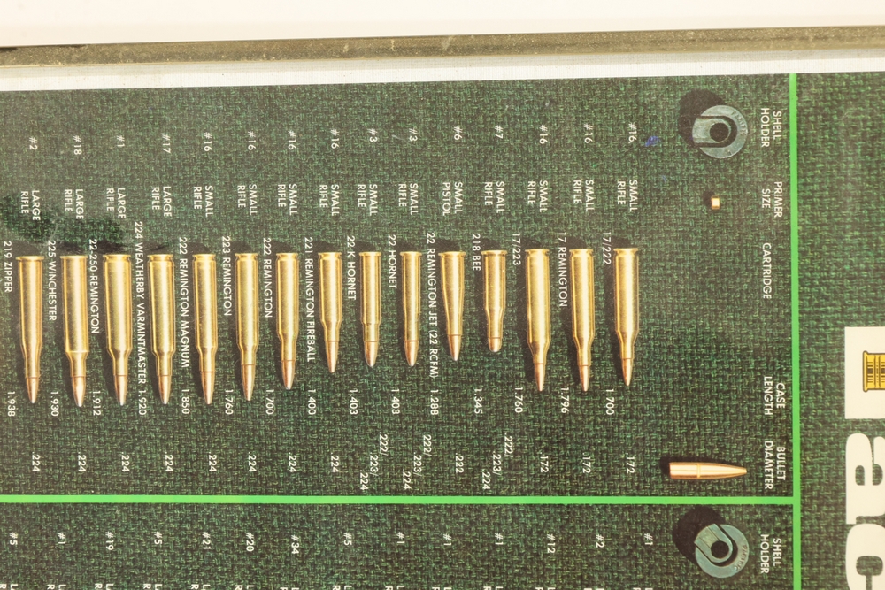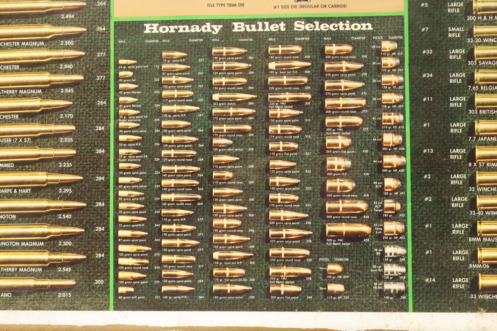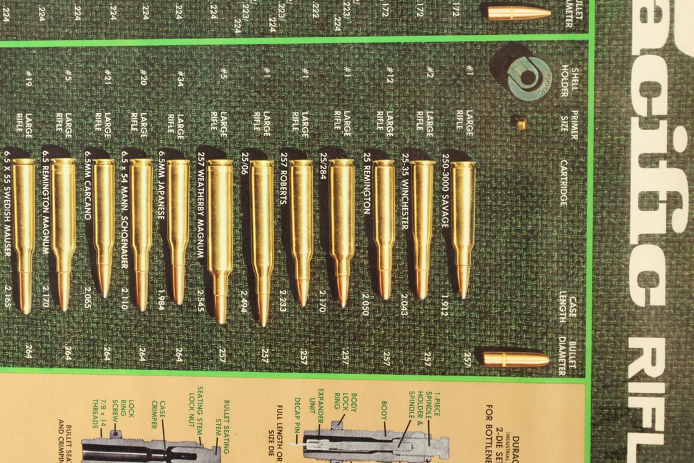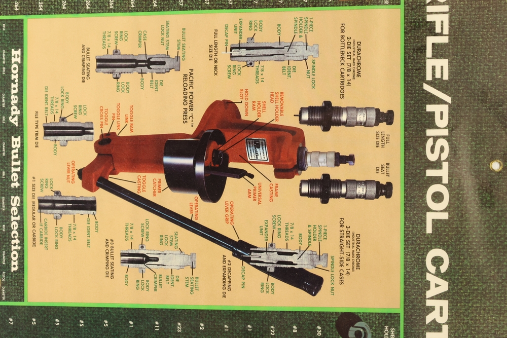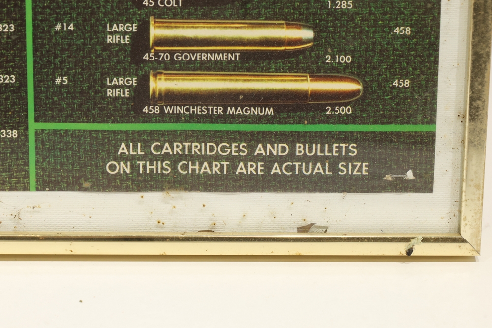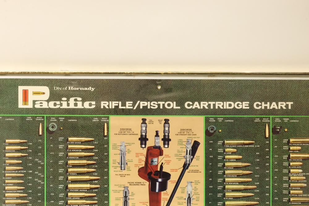 Framed Pacific Rifle/Pistol Cartridge Chart by Hornady, displaying actual-size illustrations of rifle and pistol cartridges with cartridge names, dimensions, bullet selection references, and reloading press component diagrams, housed in a metal frame. All lots are subject to all applicable laws at the time of transfer. NOTE: Semi automatic rifles and all handguns require a license in NYS. There is a $35 transfer fee per long gun. There is a $40 transfer fee per hand gun. There is a $20 transfer fee per ammunition lot. If you fail the background check, the transfer fee still applies, and you are still required to make payment and then reconsign the lot to auction. FFL dealers are not exempt from these fees. A background check will be required for all buyers purchasing a firearm and/or ammunition. NYS charges a background check fee for all firearms and ammunition. The fee is $9 for firearms and $2.50 for ammunition. The NYS fee is per background check NOT per lot, will be collected directly by Civil Armory, and is in addition to transfer fees.