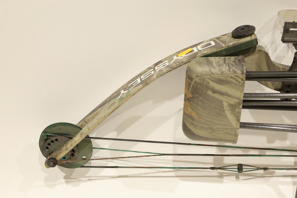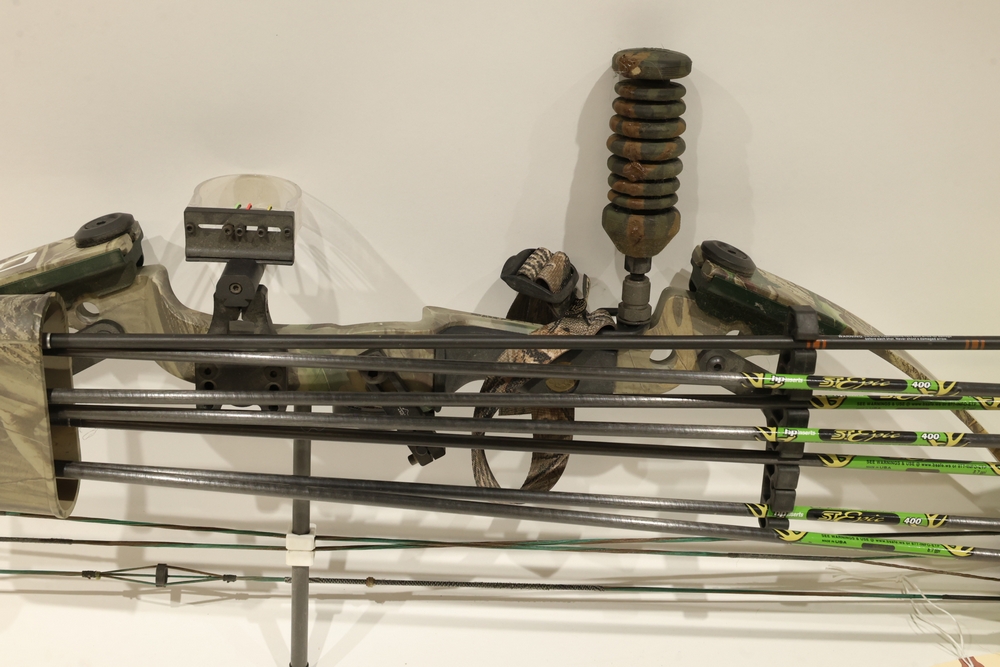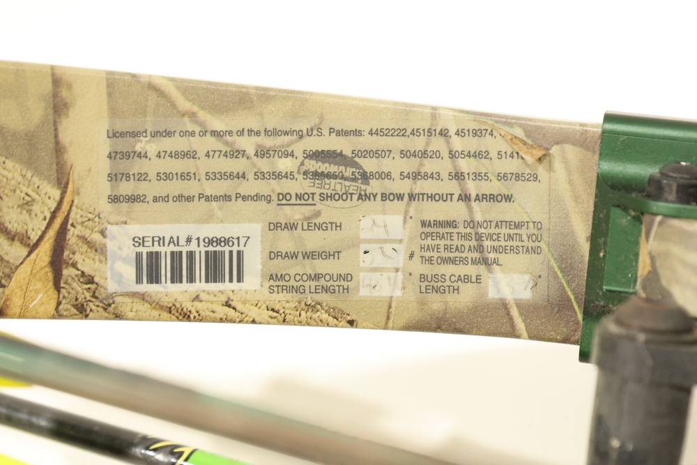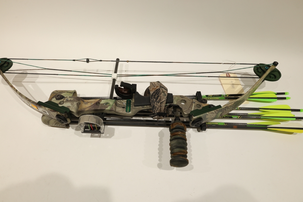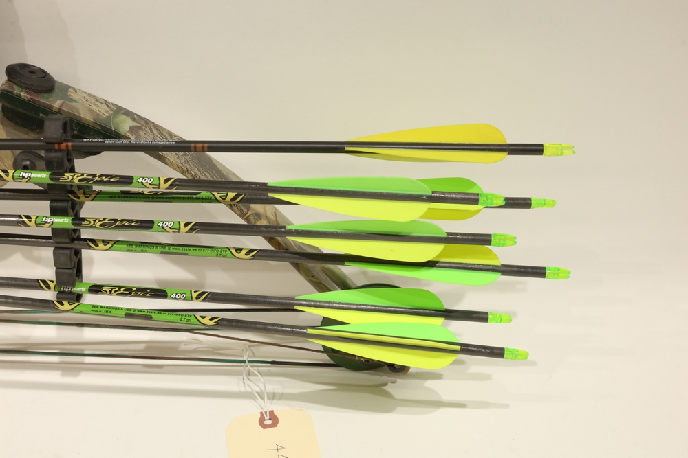 Compound bow with camouflage finish, fitted with a multi-pin sight, stabilizer, arrow rest, and mounted quiver. Includes multiple arrows with green fletching shown in the photos. Manufacturer and model markings are visible on the bow. All lots are subject to all applicable laws at the time of transfer. NOTE: Semi automatic rifles and all handguns require a license in NYS. There is a $35 transfer fee per long gun. There is a $40 transfer fee per hand gun. There is a $20 transfer fee per ammunition lot. If you fail the background check, the transfer fee still applies, and you are still required to make payment and then reconsign the lot to auction. FFL dealers are not exempt from these fees. A background check will be required for all buyers purchasing a firearm and/or ammunition. NYS charges a background check fee for all firearms and ammunition. The fee is $9 for firearms and $2.50 for ammunition. The NYS fee is per background check NOT per lot, will be collected directly by Civil Armory, and is in addition to transfer fees.