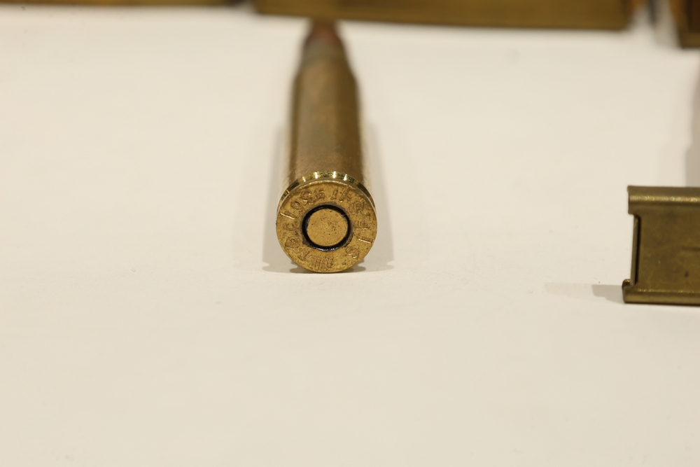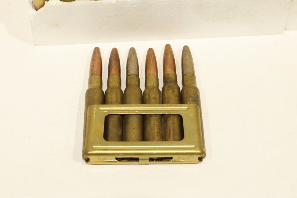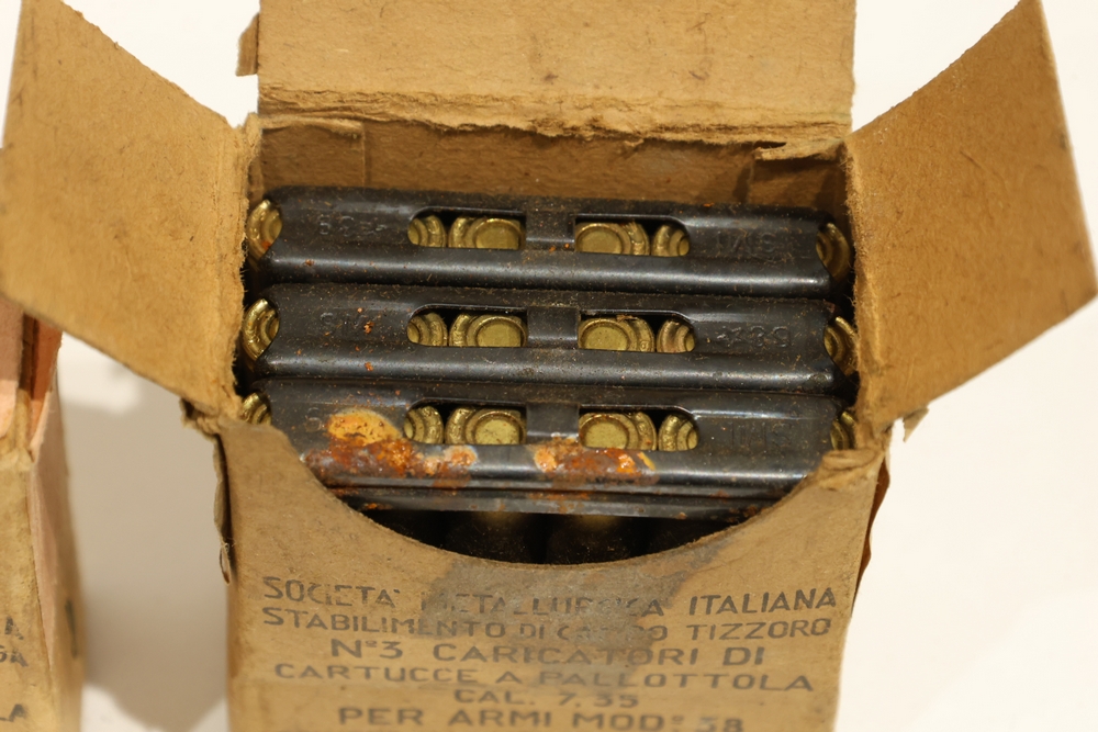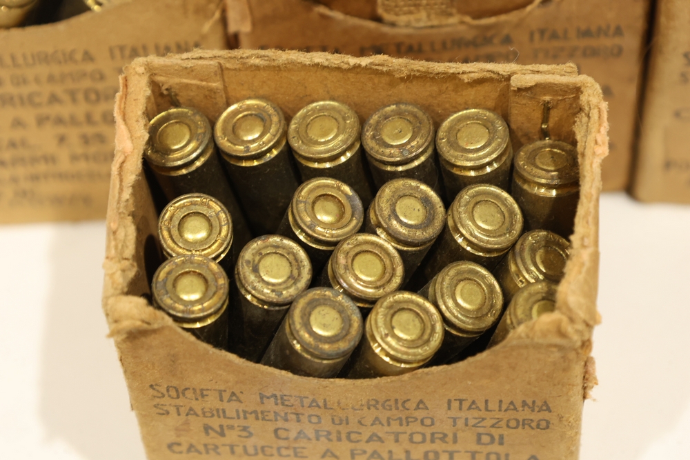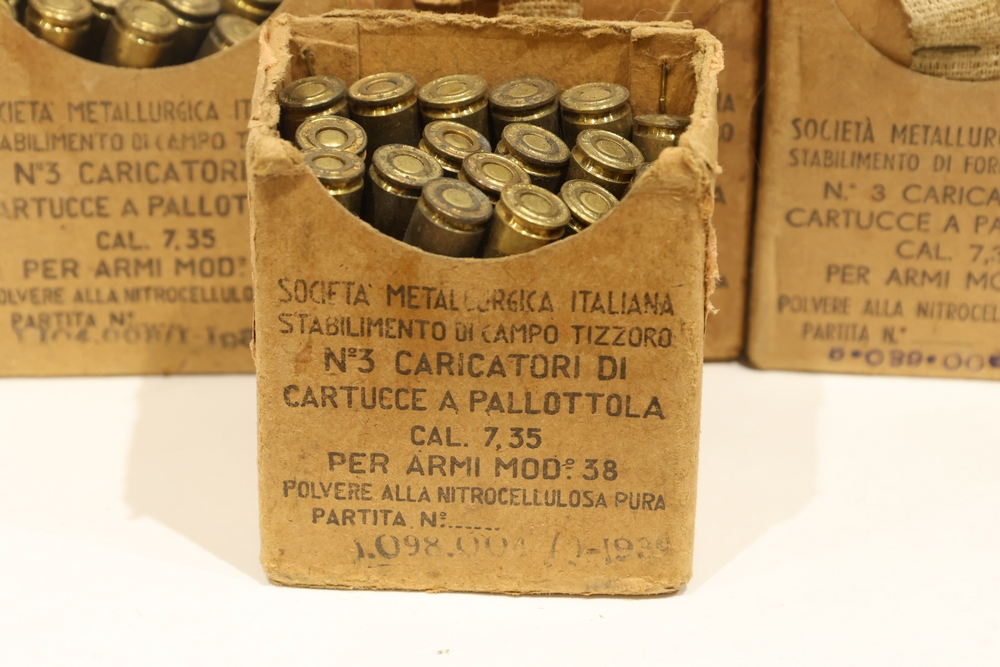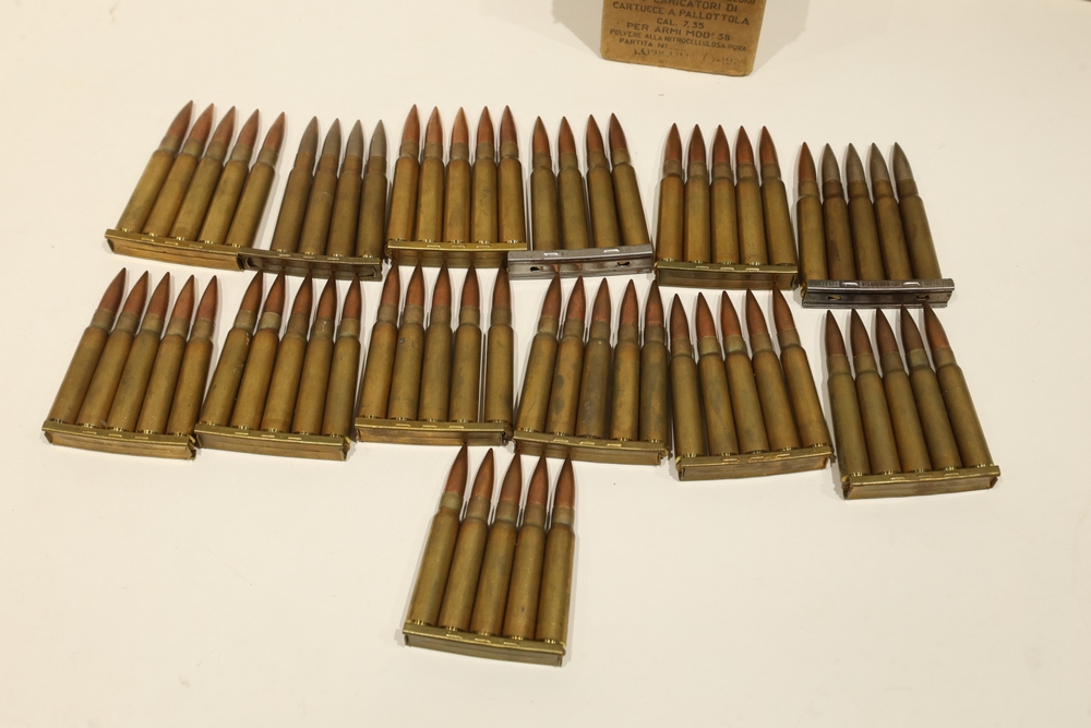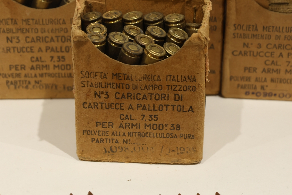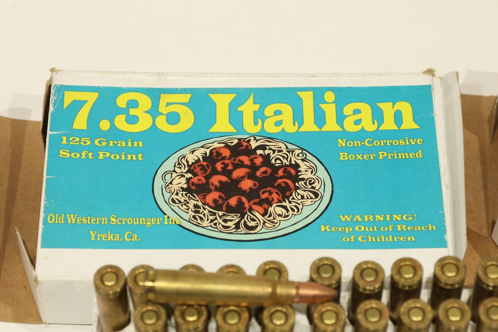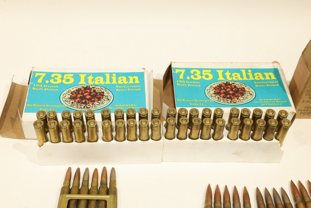 Mixed lot of rifle ammunition, including 7.35×51mm Italian and 7.9×57mm (8mm Mauser) cartridges. Lot includes ammunition packaged in Italian military-style cardboard boxes labeled Società Metallurgica Italiana, as well as loose cartridges on stripper clips and boxed commercial ammunition marked 7.35 Italian, 125 grain soft point. Approx 160 rounds total.