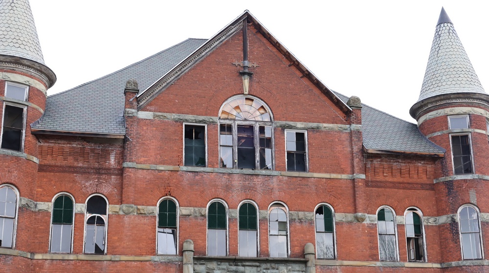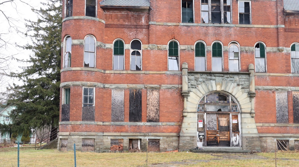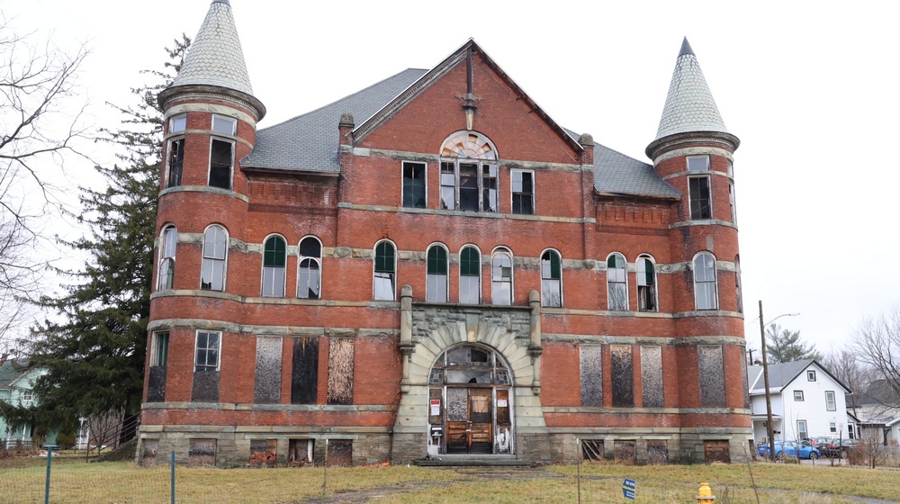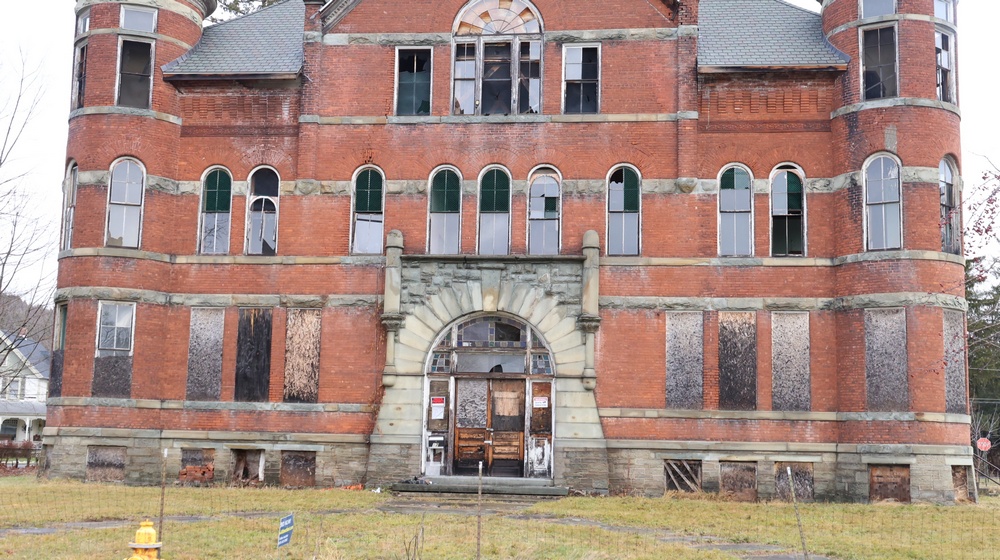 | Striking three-story brick building constructed circa 1900, with approximately 18,604+/- square feet. Originally constructed and used as a school building and served as a central institutional facility within the community. The exterior consists of masonry construction with arched and rectangular windows and stone foundation elements. The roof has been replaced with a 50-year architectural shingle, as reported. Inside consists of large rooms and open areas across multiple levels, with restoration work underway, including removal of portions of flooring, wall finishes, and ceilings. Exposed framing and structural elements are present throughout. A number of original fixtures and architectural elements remain, including chandeliers, water fountains, wood trim, chalkboards, and labeled interior doors consistent with former classroom use. The third floor includes a large open space historically used as a gymnasium, with exposed timber trusses and roof framing and skylight openings providing natural light. Property Class 449 – Other Storage. The site is zoned R3, public water and public sewer. The parcel contains approximately 0.56 acres. Located near the Susquehanna River between I88 corridor between Binghampton and Albany and Route 7. No representations are made regarding current occupancy or permitted future use. Buyers are responsible for their own inspection and verification of zoning, condition, and allowable uses prior to bidding. |