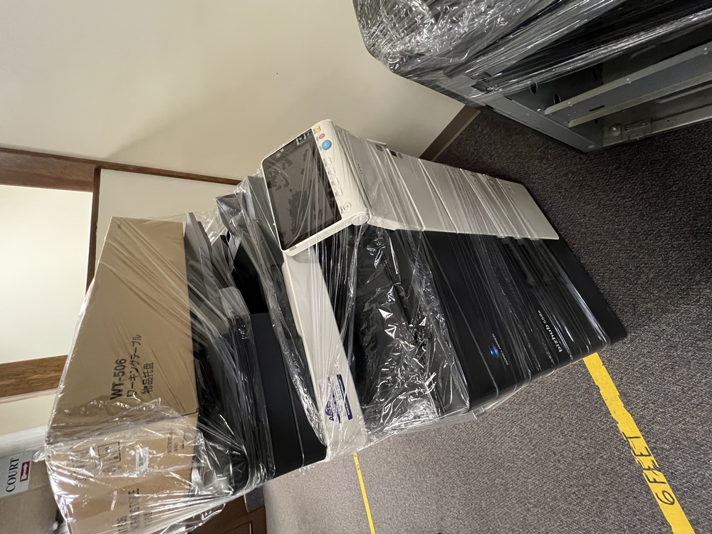 Minolta Bizhub 551i copy machine. SN: ADXR011004233. Includes PC416 LCC, FS539 finisher, RU513 relay unit, FK514 fax kit and work table. Paper count: 410,000. Seller reports: operated when removed from service.