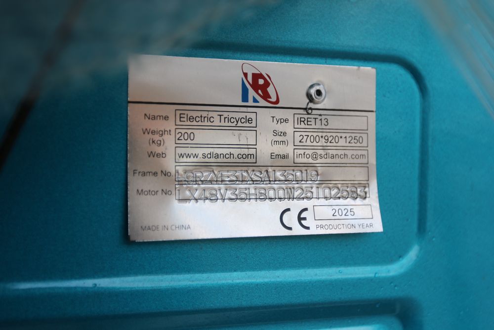 New 2025 electric three-wheeled golf cart with dump body model IRET13 with 800W motor, LCD display, and comfortable luxury double seat. Comes disassembled. Appearing to have all parts included.