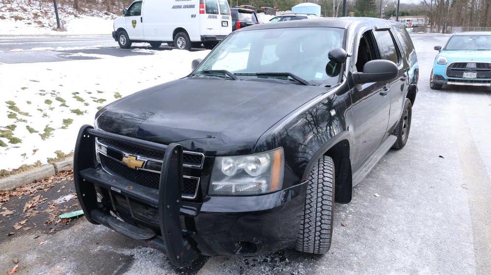 2014 Chevrolet Tahoe Police with a 5.3L V8 OHV FFV engine. VIN: 1GNLC2E01ER182407. Odometer reading: 140806. Body: Full-size four-door sport utility vehicle in police configuration. Equipped with a front push bumper, steel wheels, black exterior trim, and tinted rear windows. Interior features include cloth seating, center console equipment mount, factory Chevrolet radio, HVAC controls, floor-mounted automatic transmission selector, auxiliary wiring and mounts associated with police use, and analog gauge cluster. Seller reports: Rusty, runs and drives, title and key available. Must be towed.