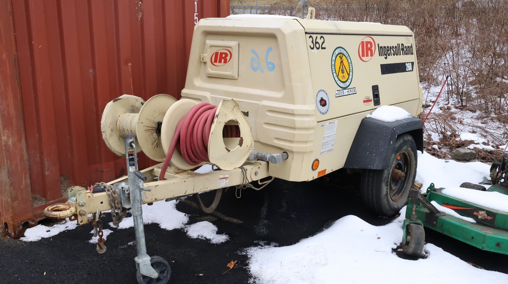 2002 Ingersoll-Rand 260 towable air compressor, VIN: 4FVCABA62U3293278. Meter reads 763.9 hours. Trailer GVWR: 3,334 lbs. Tire size: P215/75R15. Equipped with pintle hitch, dual hose reels, and diesel engine (inline 4-cylinder). Seller reports: operational. Must be towed.