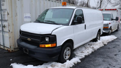 2017 Chevrolet Express G2500 cargo van with a 6.0L V8 OHV 16V FFV engine. VIN: 1GCZGGFG2H1110361. Odometer reading: 41758. Body: Full-size cargo van with rear swing doors and solid side panels. Equipped with interior metal shelving, drawer storage, and a Tripp Lite PowerVerter 3000-watt inverter mounted in the cargo area. Exterior features include steel wheels, black front bumper, and roof-mounted amber beacon. Interior includes analog gauge cluster, factory radio, HVAC controls, center console storage, and rubber floor covering. Seller reports: Rusty, Body damage, runs and drives, title and key available. Must be towed.