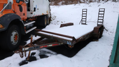 Equipment trailer with rear ramps, tandem axles, and wood deck. Bill of sale only. Must be towed.