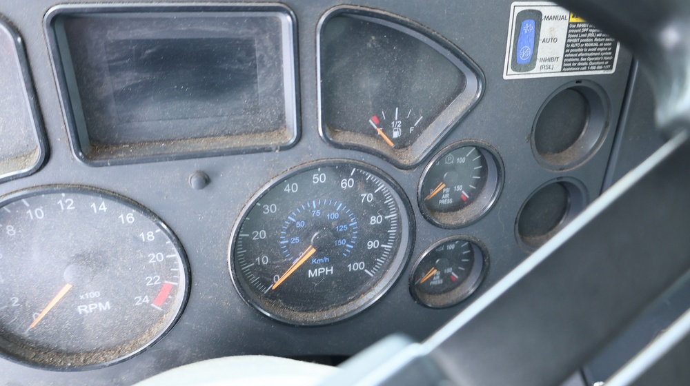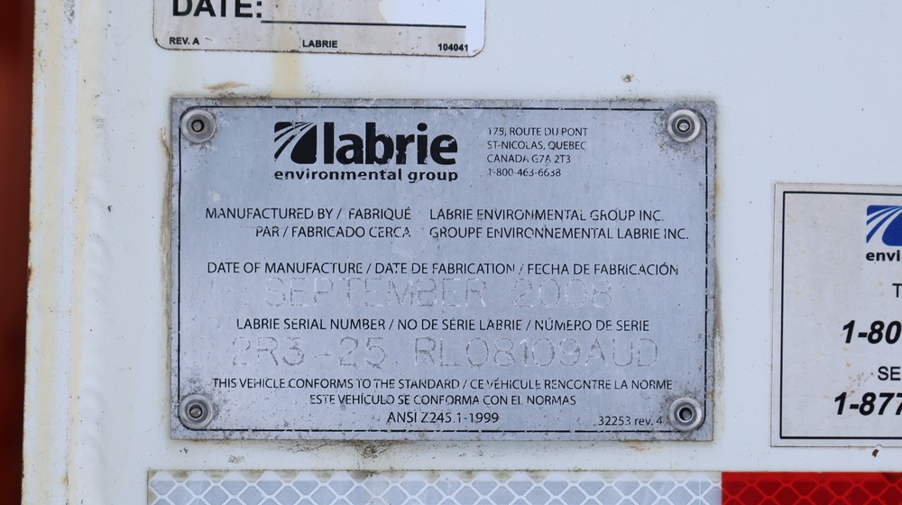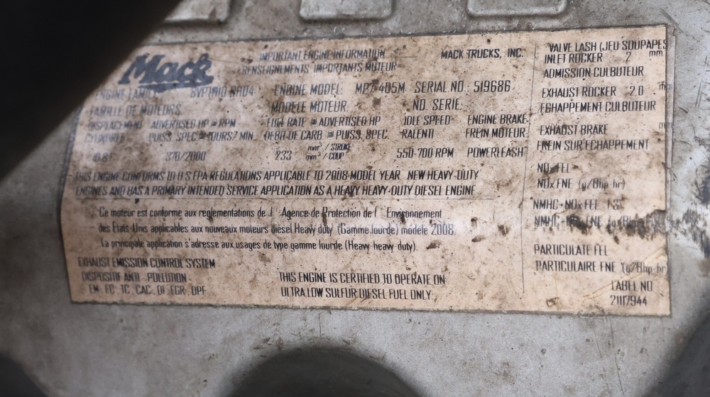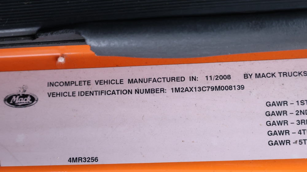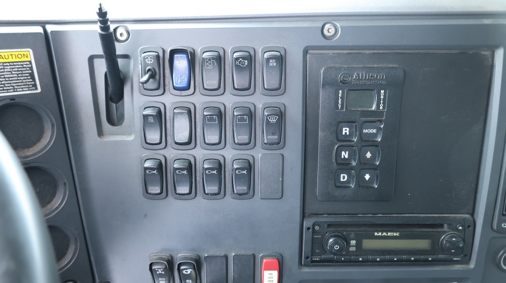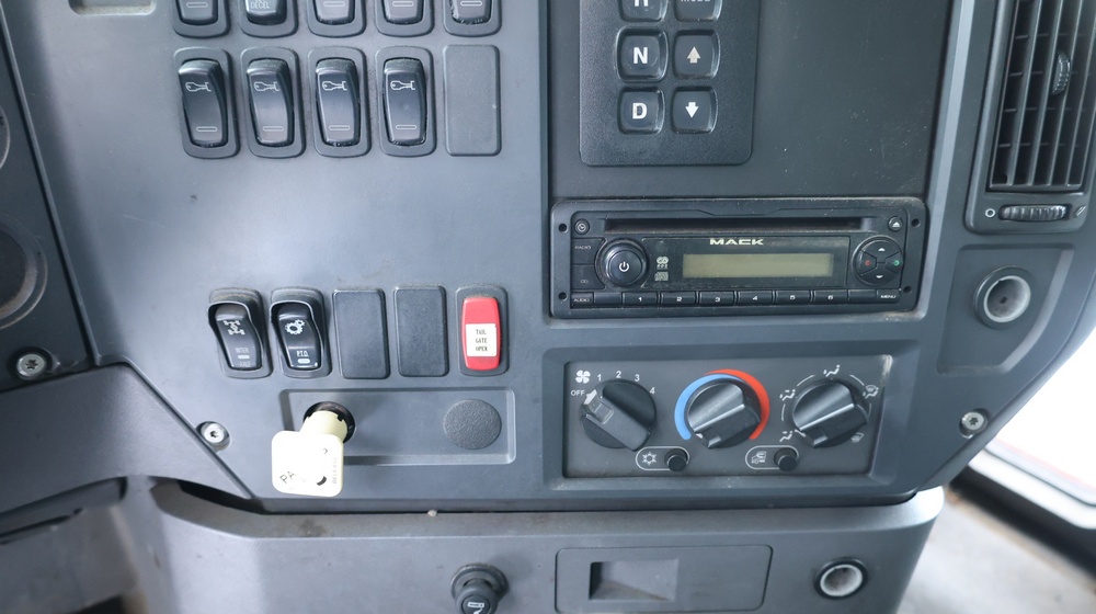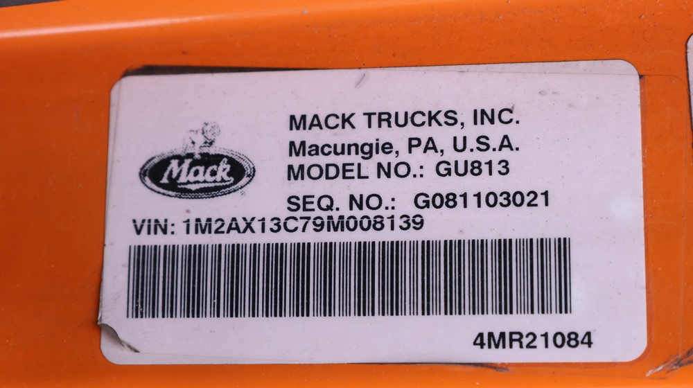 2009 Mack GU813 garbage truck with a 10.8L L6 diesel engine. VIN: 1M2AX13C79M008139. Odometer reading: 105128. Body: Cab-behind-engine refuse truck with rear-load garbage body manufactured by Labrie Environmental Group. Tandem rear axle configuration. Municipal lighting, front bumper guard, dual rear wheels, and rear refuse compactor equipment. Interior controls include HVAC, Mack radio, Allison automatic transmission selector, differential lock, PTO, and auxiliary lighting switches. Seller reports: Runs and drives, Rusty, Transmission Issues, Title and key available. Must be towed.