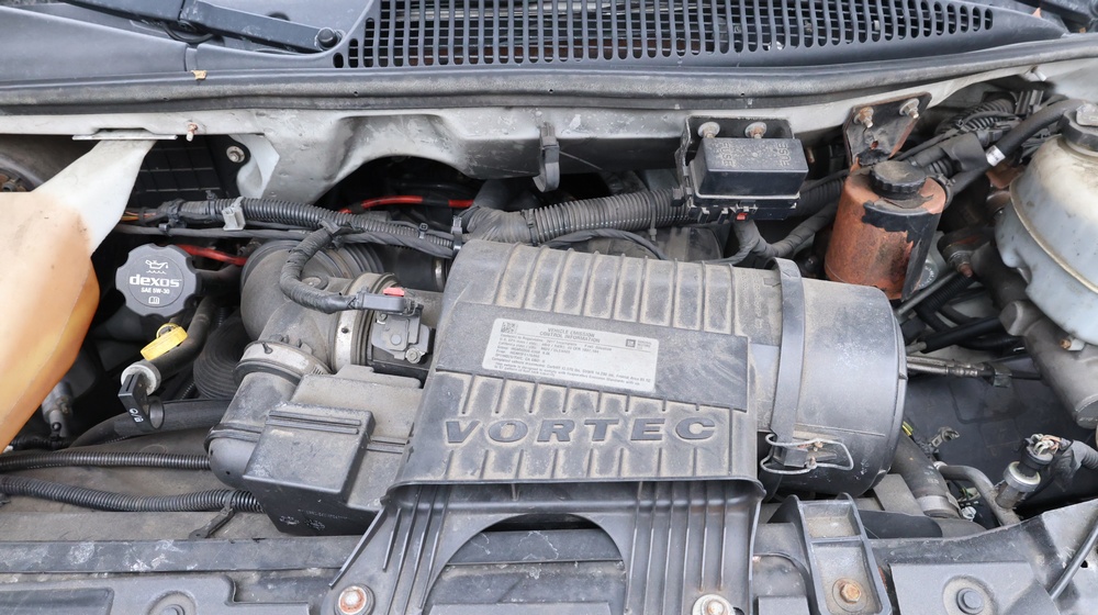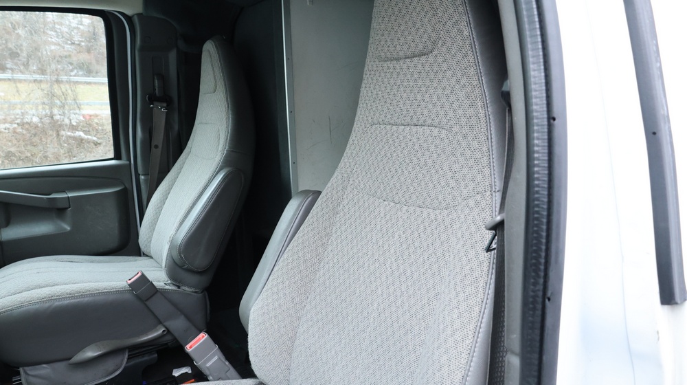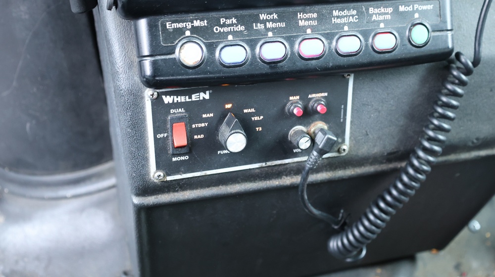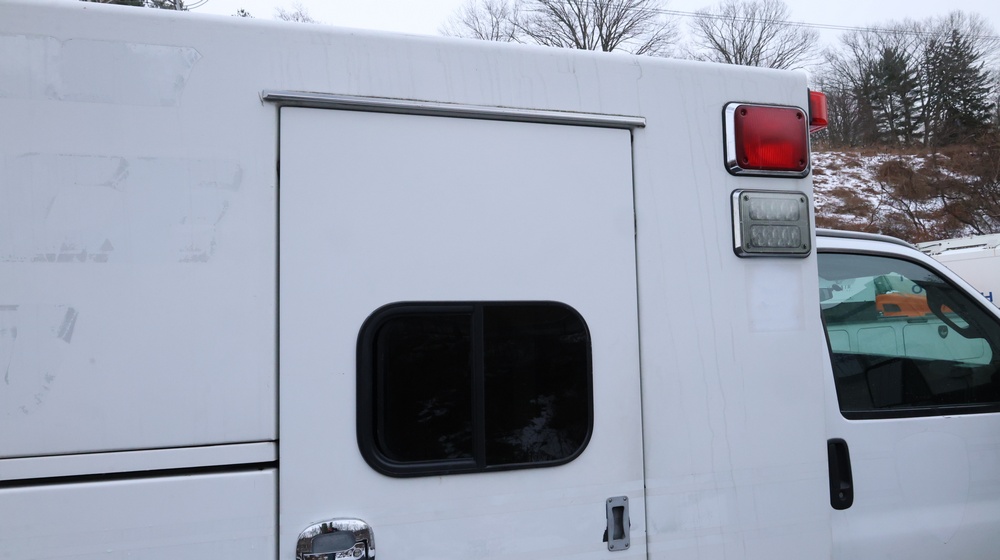 2017 Chevrolet Express G3500 cutaway ambulance with a 6.0L V8 gasoline engine. VIN: 1GB3GRCG7H1107451. Odometer reading: 138199. Body: Cutaway chassis fitted with an ambulance body manufactured by Braun Industries, Inc. Single rear wheel configuration. Roof-mounted emergency lighting, side utility compartments, rear double doors with chevron striping, and rear step bumper. Interior controls include HVAC, factory radio, automatic transmission selector, Whelen emergency control panel, radio microphone, auxiliary switches, and rear ambulance compartment with seating, storage cabinetry, and equipment mounts. Seller reports: Runs and drives, title and key available. Must be towed.