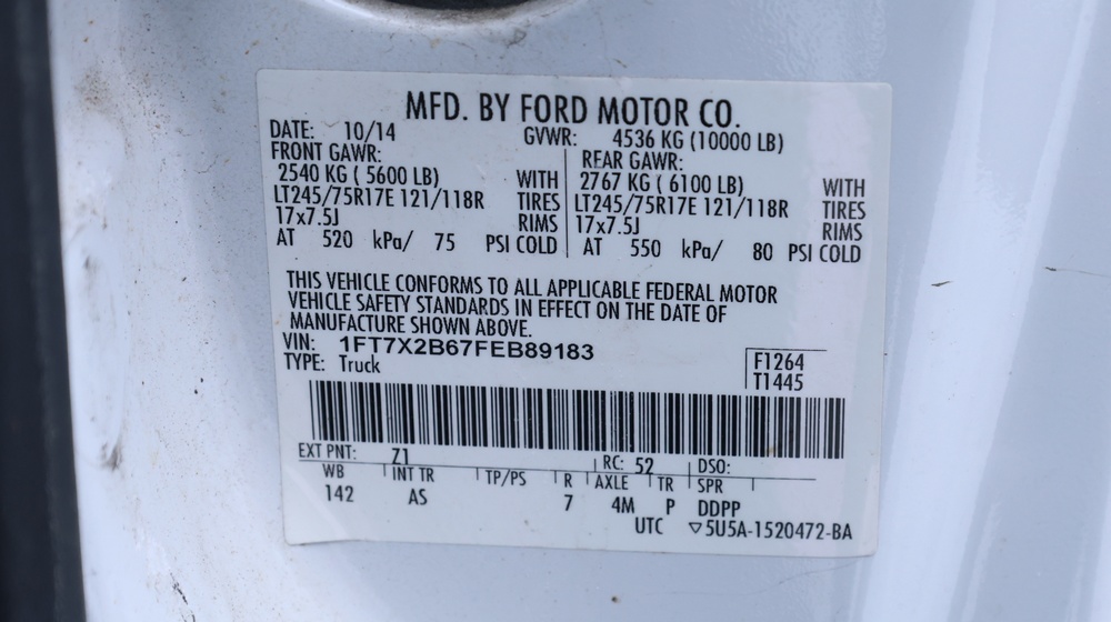 2015 Ford F-250 Super Duty XLT 4WD pickup with a 6.2L V8 gas engine and automatic transmission. VIN: 1FT7X2B67FEB89183. Odometer reading: 121623. Body: SuperCab pickup with long bed. Equipped with roof-mounted marker lights, tow mirrors, rear hitch receiver, and steel pickup bed with mounted diamond-plate toolbox. Interior features include analog gauge cluster, Ford factory radio, HVAC controls, column-mounted automatic transmission selector, and auxiliary dash switch blanks. Seller reports: Rusty, Engine runs poor/Exhaust leak, runs and drives, title and key available. Must be towed.
