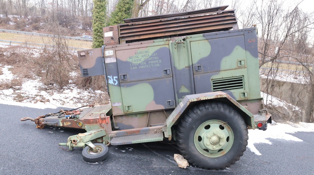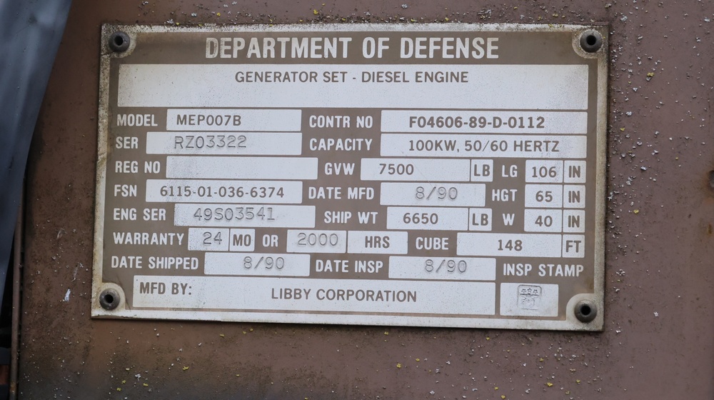 1990 Military Generator. MEP007B / S/N # RZ03322. Hour meter reading: 94. Unknown operating condition. Must be towed.