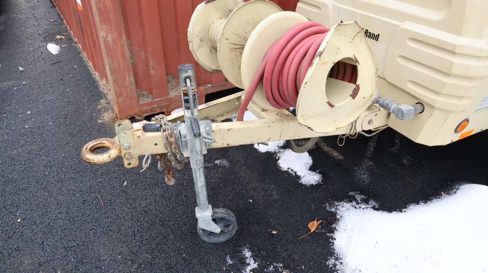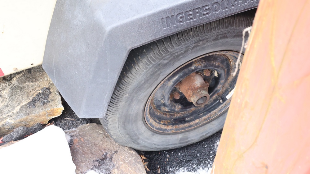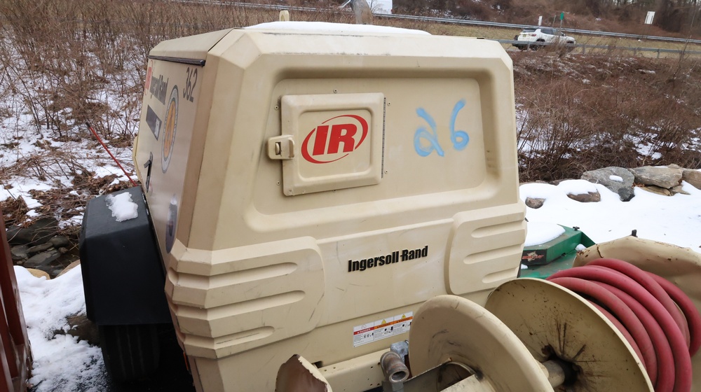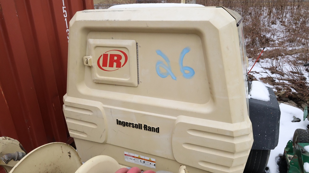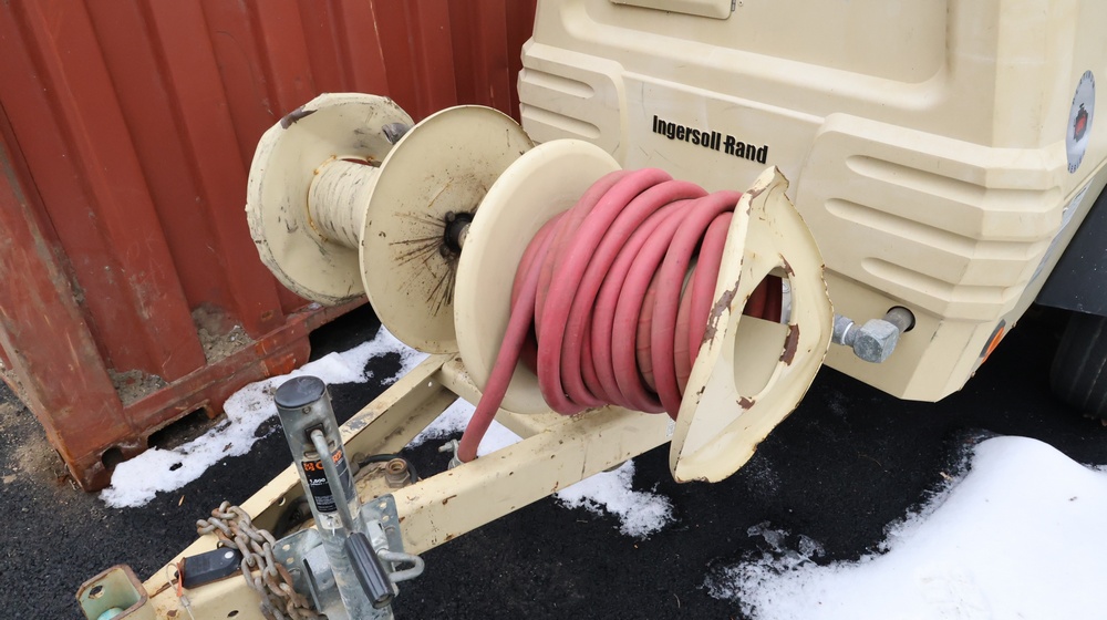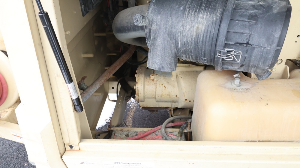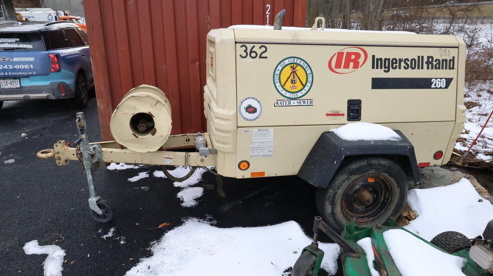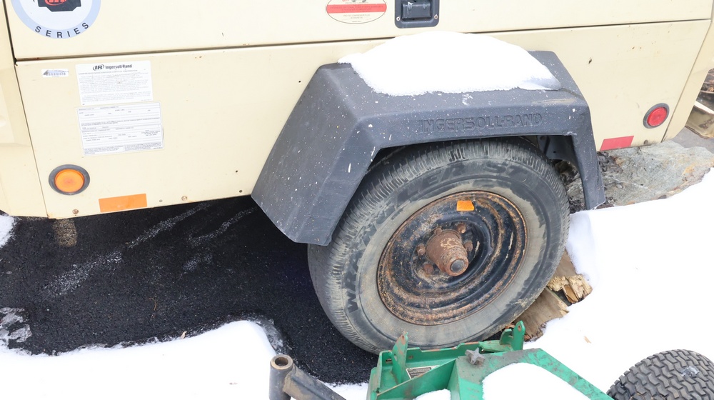 2002 Ingersoll-Rand 260 towable air compressor, VIN: 4FVCABA62U3293278. Meter reads 763.9 hours. Trailer GVWR: 3,334 lbs. Tire size: P215/75R15. Equipped with pintle hitch, dual hose reels, and diesel engine (inline 4-cylinder). Seller reports: operational. Must be towed.