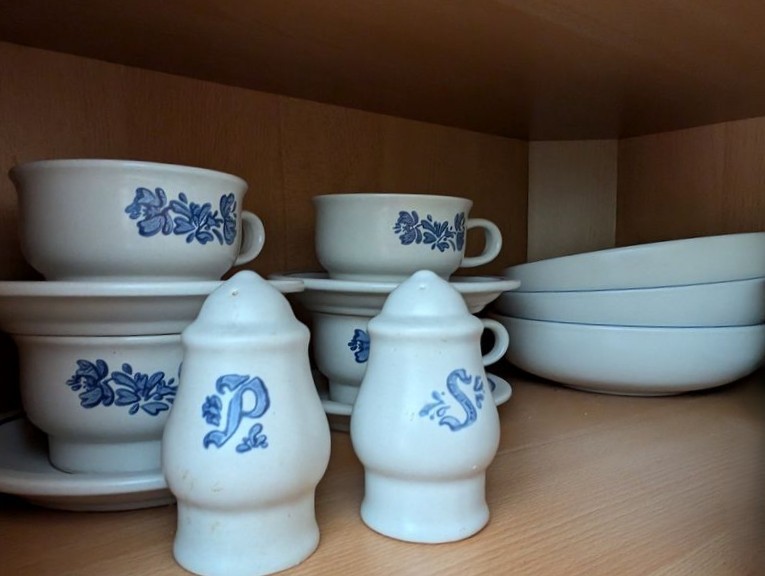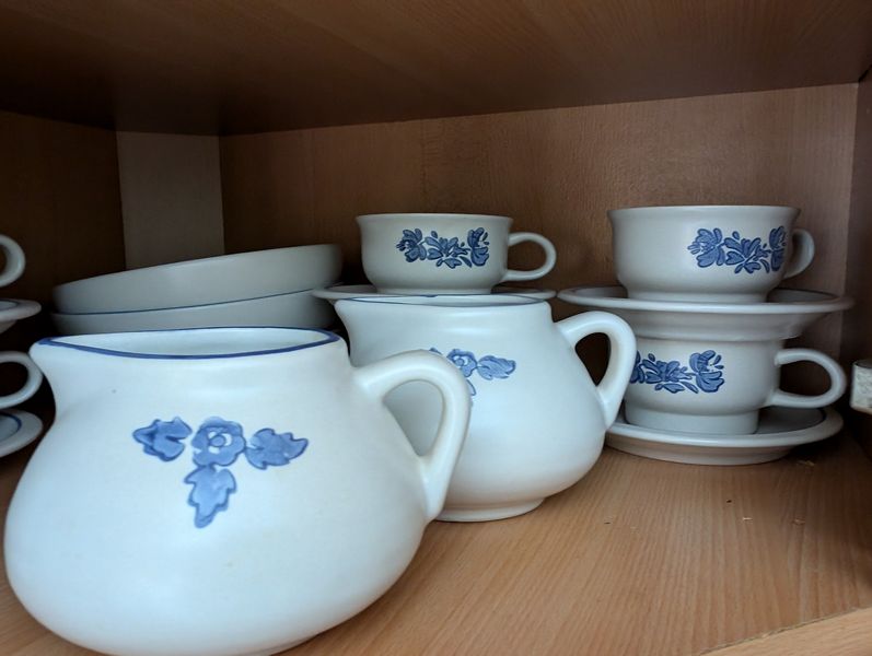 Pfaltzgraff Dishes and Glasses. Glasses (smokey-blue) incl: juice (6), wine (6), iced tea (4); "Yorktown" dishes, 42 pieces, incl plates, bowls, cups, saucers. S&P, creamers. See photos for details.