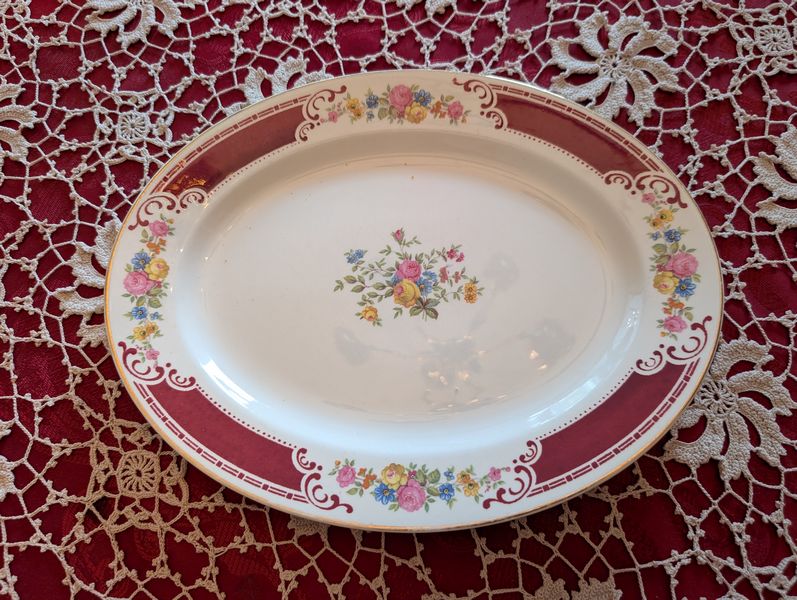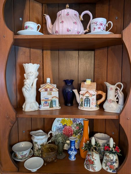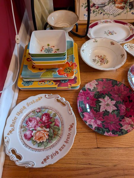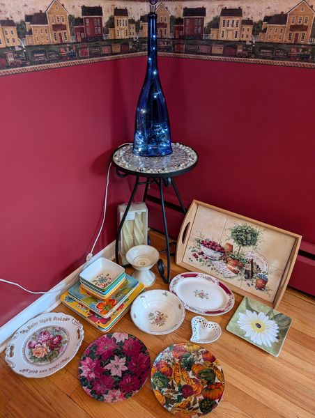 Serve ware and Décor. Quality plates and bowls, incl: Homer Laughlin, 1'L platter; Knowles, 9"diam bowl; Lenox pedestal dish, 6"H; handled wood & tile serv tray, 20"Lx13"W; 12-pc colorful melamine dish & bowl set; round mosaic table, 14:diam x23"H; blue lit bottle decor, 21"H; covered tea pots; tea cups & saucer sets; creamers; vases; bells. See photos. Wood corner cab not incl.