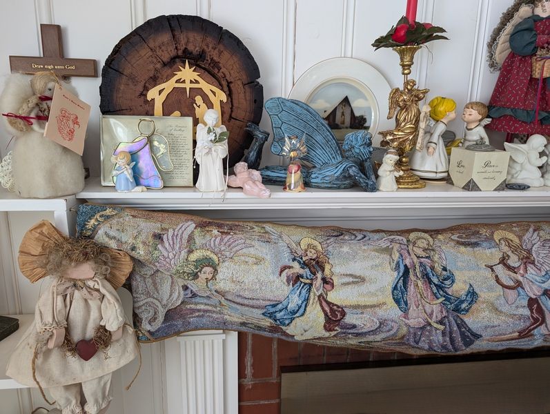 Angel Décor. Approx two dozen angels, from 3"H to 17"H; runner 72"Lx13"W; incl candlesticks; figurines; globe; soft angels; more. See photos.