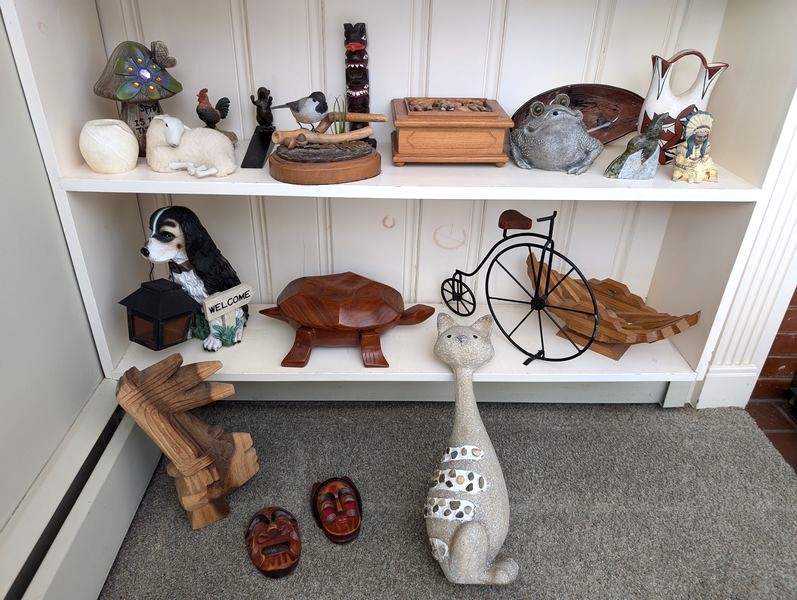 Animal Décor and Lamps. Wood wall art, 18"Wx13"H; table lamps 22"H & 2'H with shades; peace pipe, 22"L; cat décor, 18"H; also incl: birds; bears; frog; turtle; sheep; dog; mouse door stop; more! See photos.
