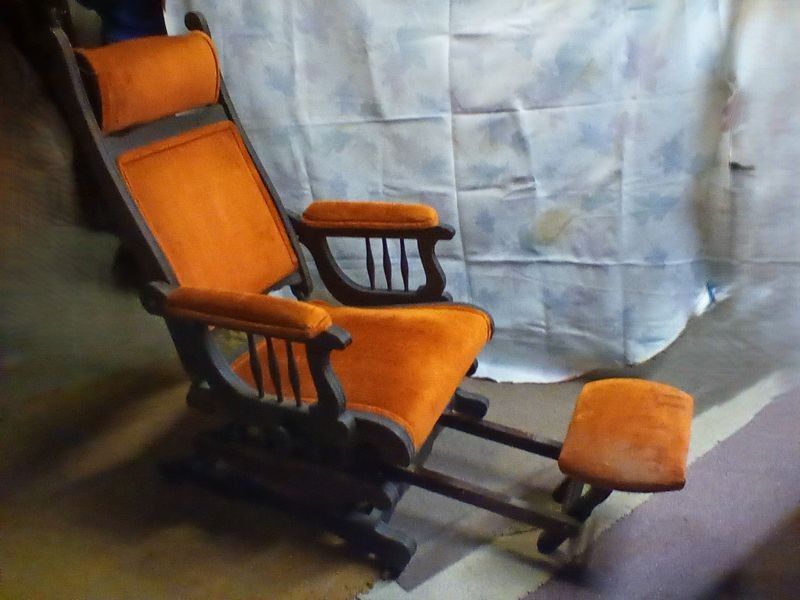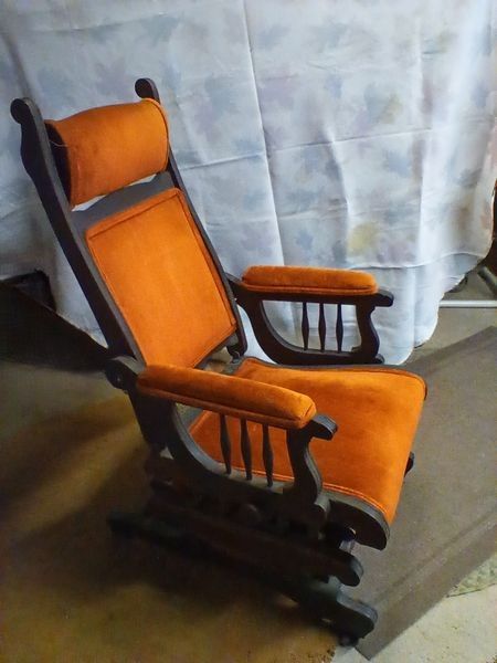 Victorian Platform Rocker. Orange velour Victorian platform rocker, 25'Wx28"Dx41"H with pull out foot stool. See photos. Loc in basement with walk out to back yard.
