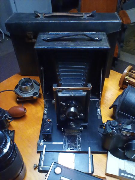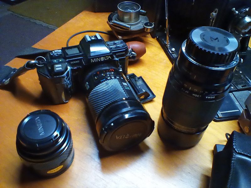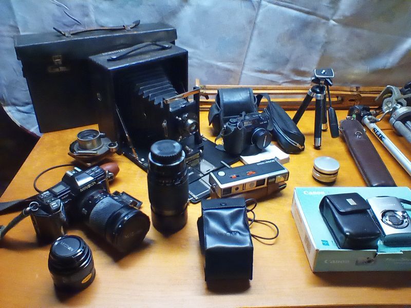 Vintage Cameras, featuring Seneca, Minolta. Antique & vintage cameras, incl: Seneca #8 camera; Minolta 35mm; lenses; tripods; camera bag; also Vivitar binoculars in case; vintage wood spyglass. See photos for more details. Loc in basement.