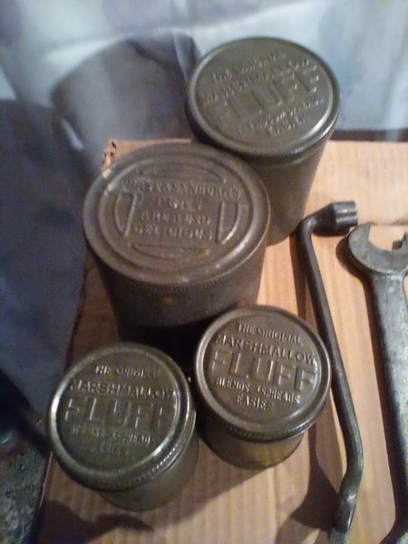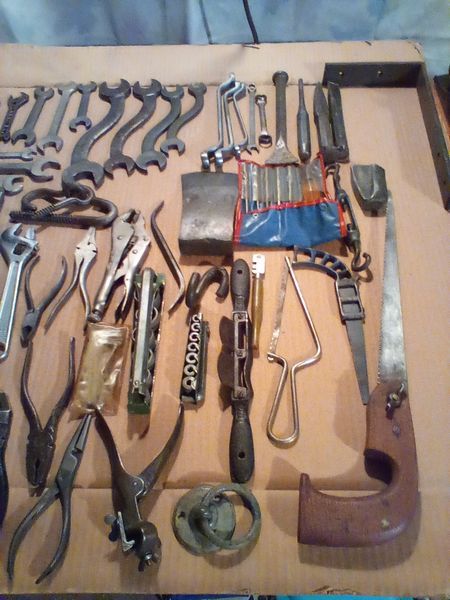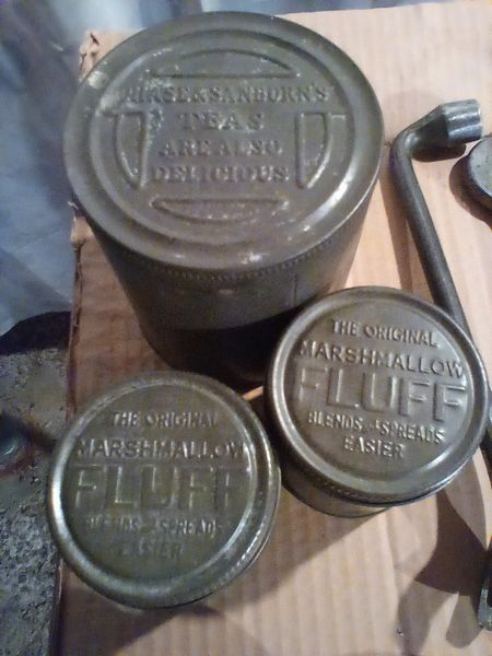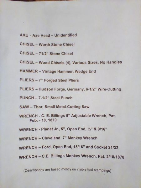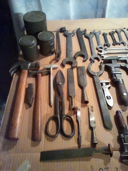 Vintage Hand Tools, Metal Food Storage. Many vintage & antique hand tools, incl wrenches, pliers, saw, chisels (see list); four metal food containers (incl 3 Marshmallow Fluff). Loc in basement.