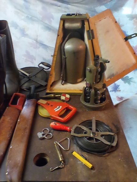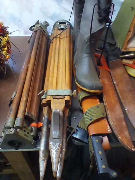 Survey Equipment. Incl field survey equipment; tripods; machete's in leather cases; boots; more! See photos for details. Loc in basement.