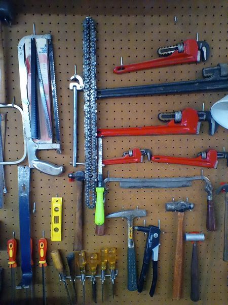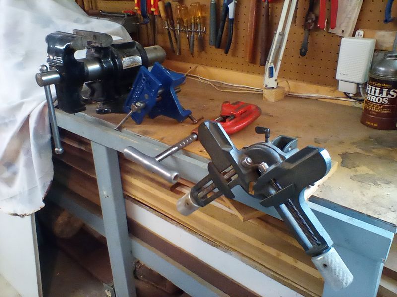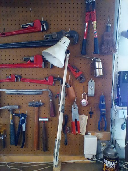 Vices and Wall Contents. Two vices (attach to workbench, bring tools to remove); tools on wall, incl: clamps; wrenches; screwdrivers; metal lamp; more! See photos. Loc in basement.