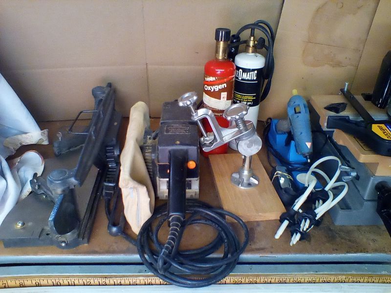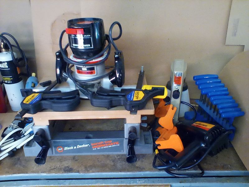 Black & Decker Table Work Bench, Craftsman Router. B&D table top work bench; Craftsman heavy duty router (see list); torch kit; Allen wrenches; clamps; belt sander; heating gun; more! Loc in basement.