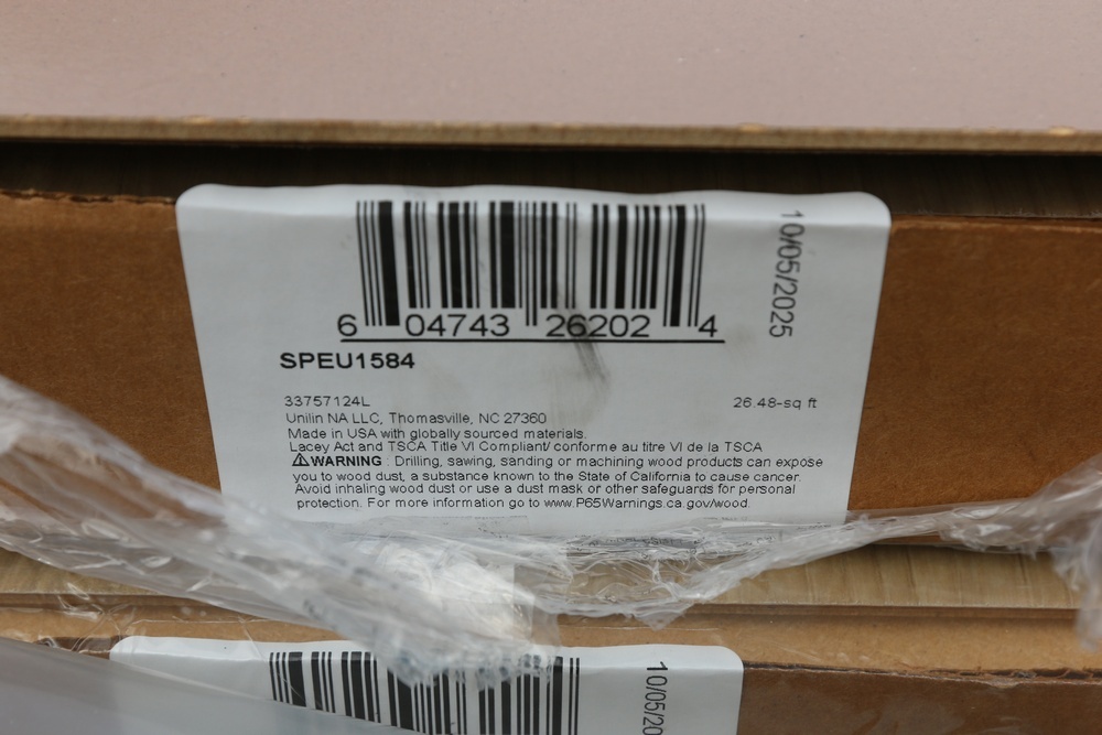 Lot is for 52 cartons of new laminate flooring. 26.48 square feet per carton. 1376.96 total square feet. Manufacturer is Mohawk. Product is Belhan Court Vintage Tea Oak. This product is Waterproof. Uni-Clic floating locking system. 2nd quality indicating up to 10% of product may have minor imperfections such as markings, off-shade, blister/missing spot of wood grain, sample board. Sold by: Square Foot. Sold as: Price X Quantity.
