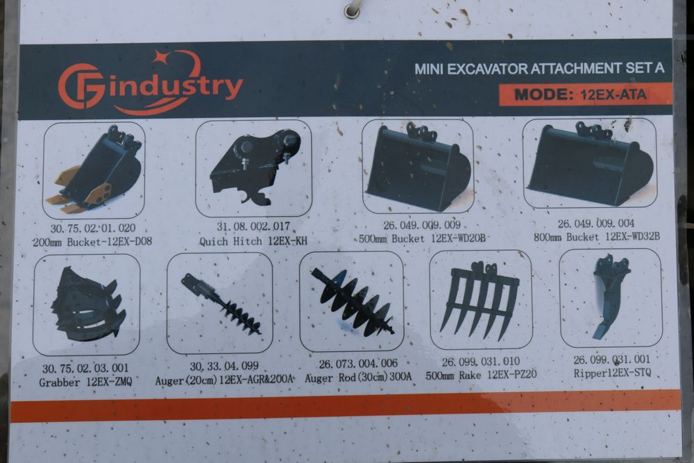 New 2026 AGT Mini Excavator Attachment Set A Model:12EX-ATA including 200mm bucket, quick hitch, 500mm bucket, 800mm bucket, grabber, 20cm auger, 30cm auger, 500mm rake, and ripper.
