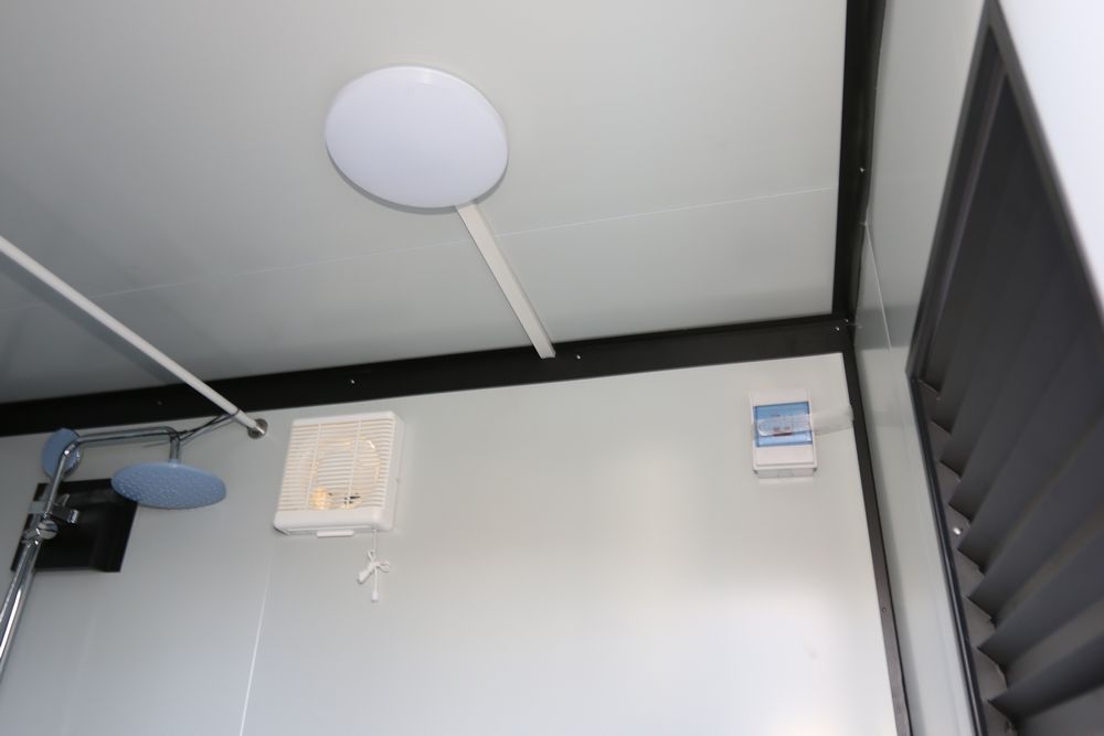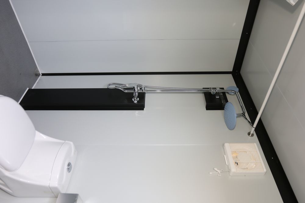 New 2026 KJ portable restroom 7'4" X 5' X 8', includes shower, toilet, toilet brush, sink, window, paper holder, exhaust fan, towel rack, shower curtain, light, model K1522.