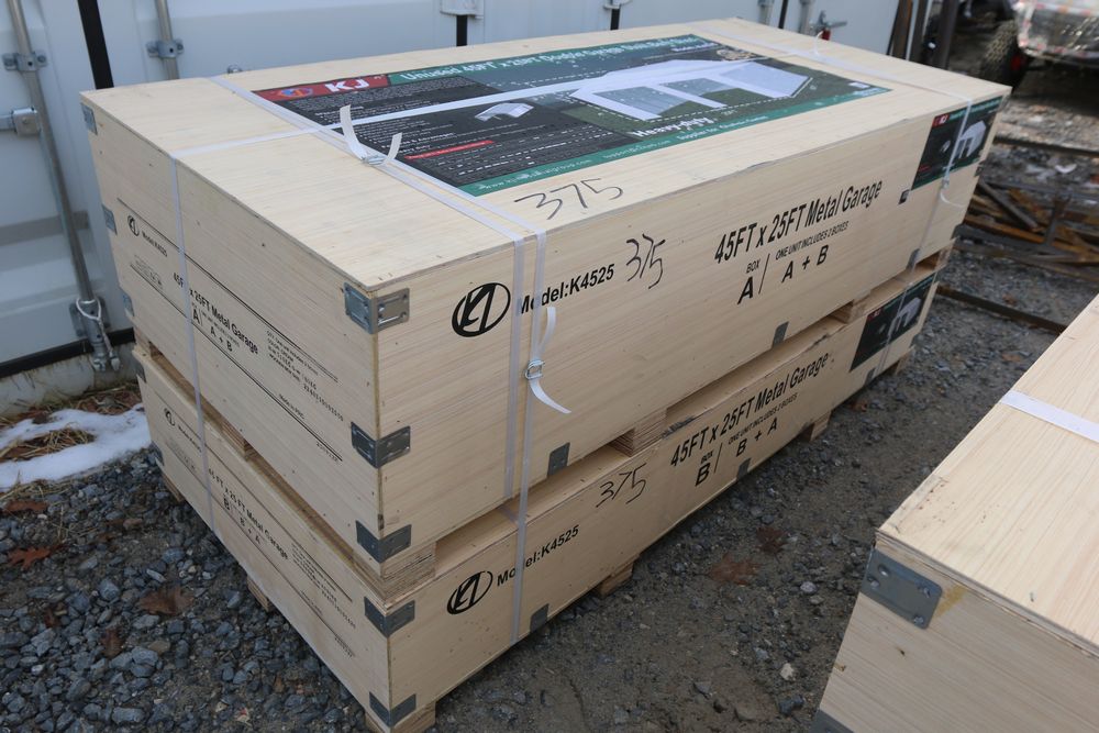 New KJ unused 45ft. x 25ft. double garage steel barn shed model K4525, in wood crate.
