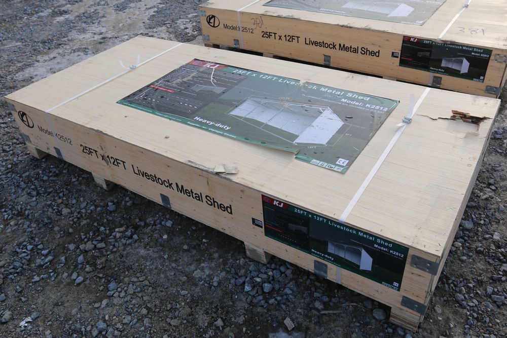 New livestock metal shed, 11'Tx12'Wx25'L, model K2512, in wood crate.