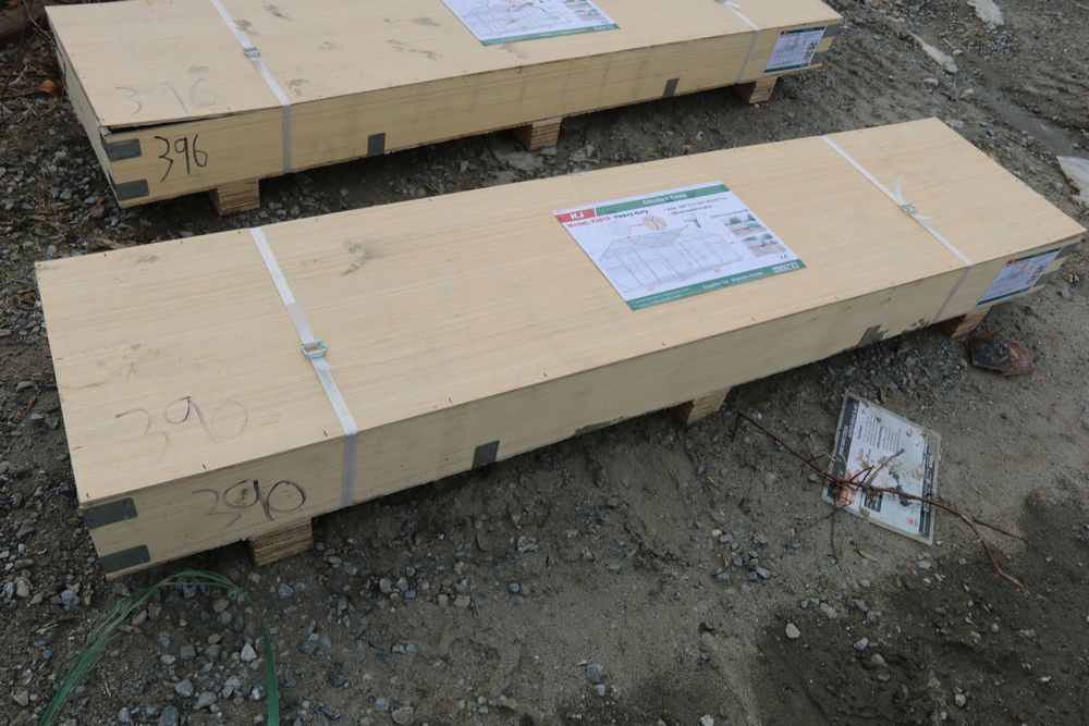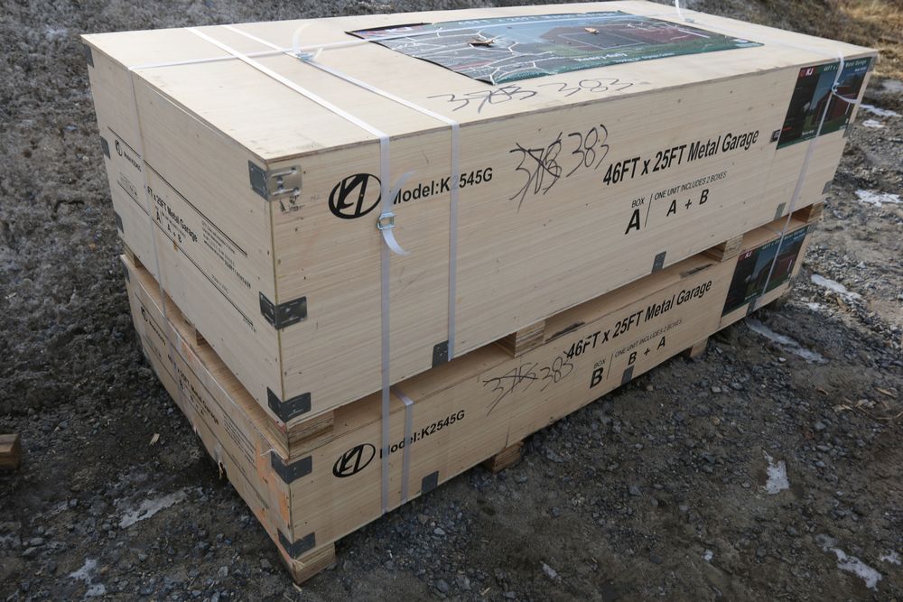 New KJ metal garage 46'Lx25'Wx15'H, model K2545G, in wood crate.