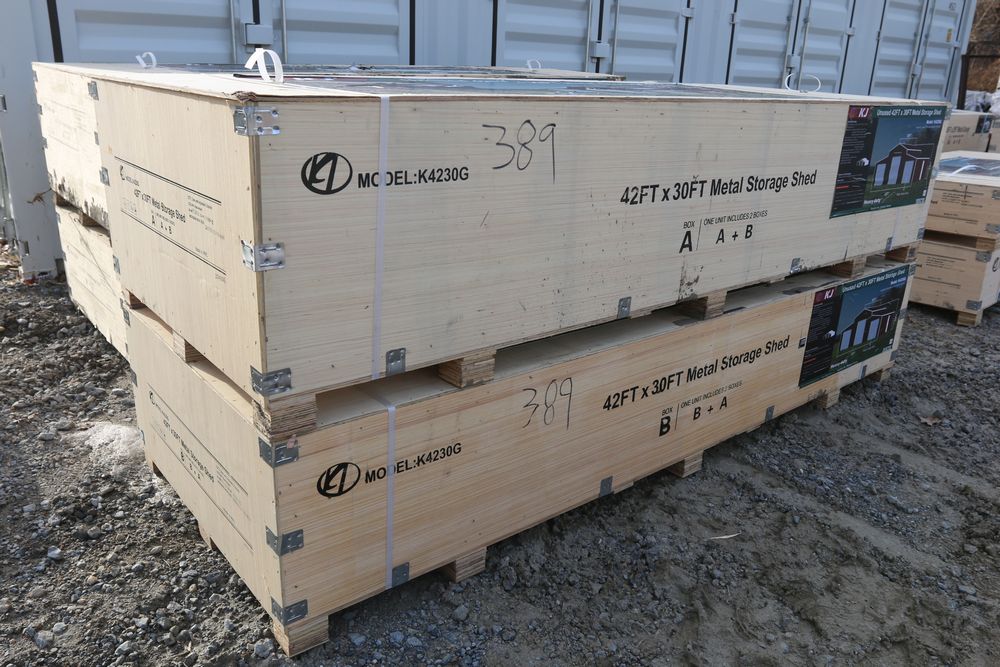 New 2026 Metal Storage Shed 42FT x 30FT Metal Storage Shed model K4230G, in wooden crate.