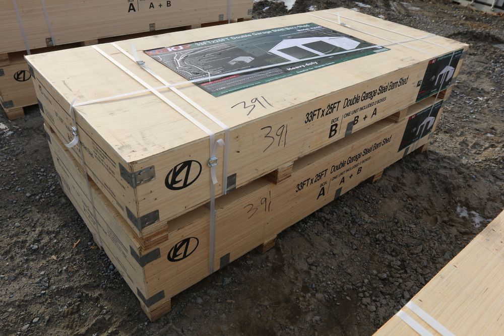 New KJ double garage steel barn shed in wood crate, 25'Wx33'Lx14'T, model K3325.