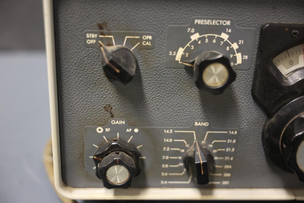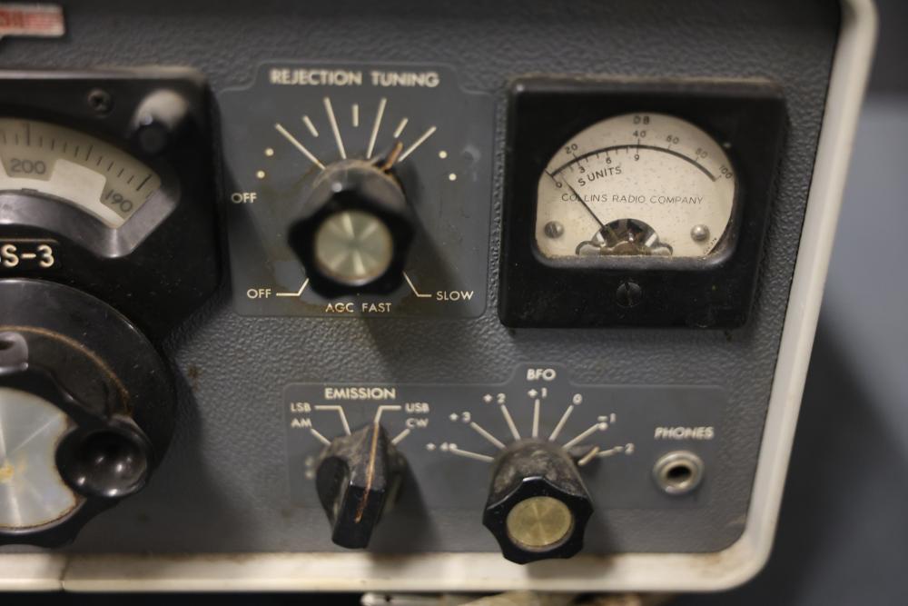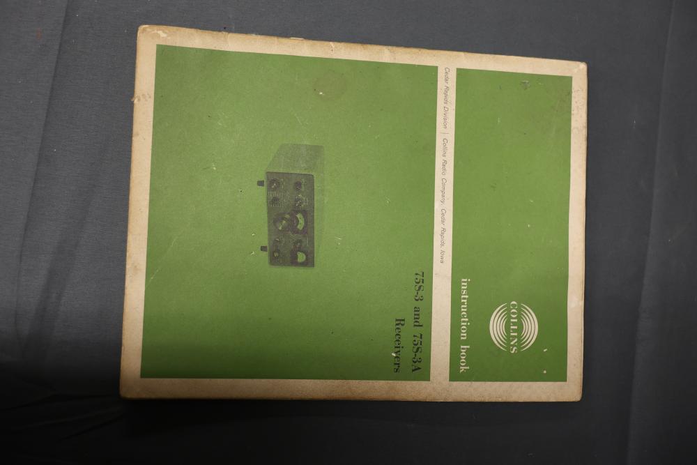 Collins 75S-3 Winged Emblem Vintage Ham Radio Receiver. The receiver includes its original instruction manual. The unit displays wear consistent with age and usage, including visible discoloration, cable fraying, and dust accumulation inside. The external casing shows wear on the metal mesh. The power requirements are listed as 115V, 50/60 CPS, 60 watts. Pickup only.