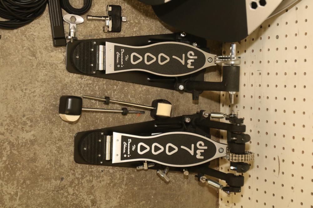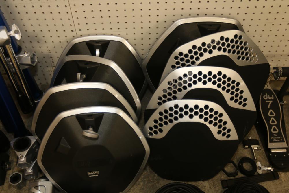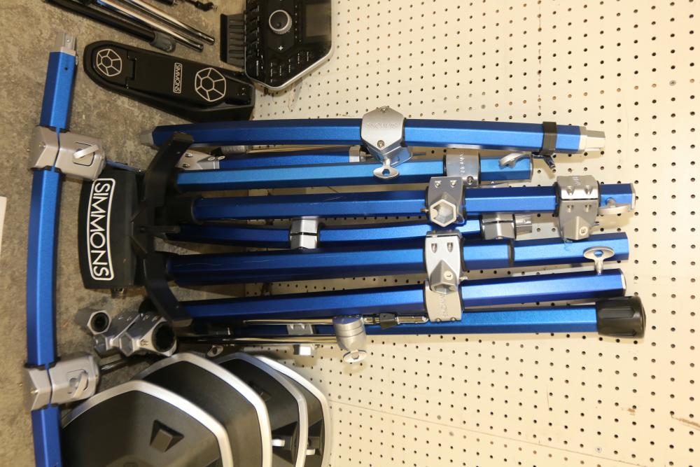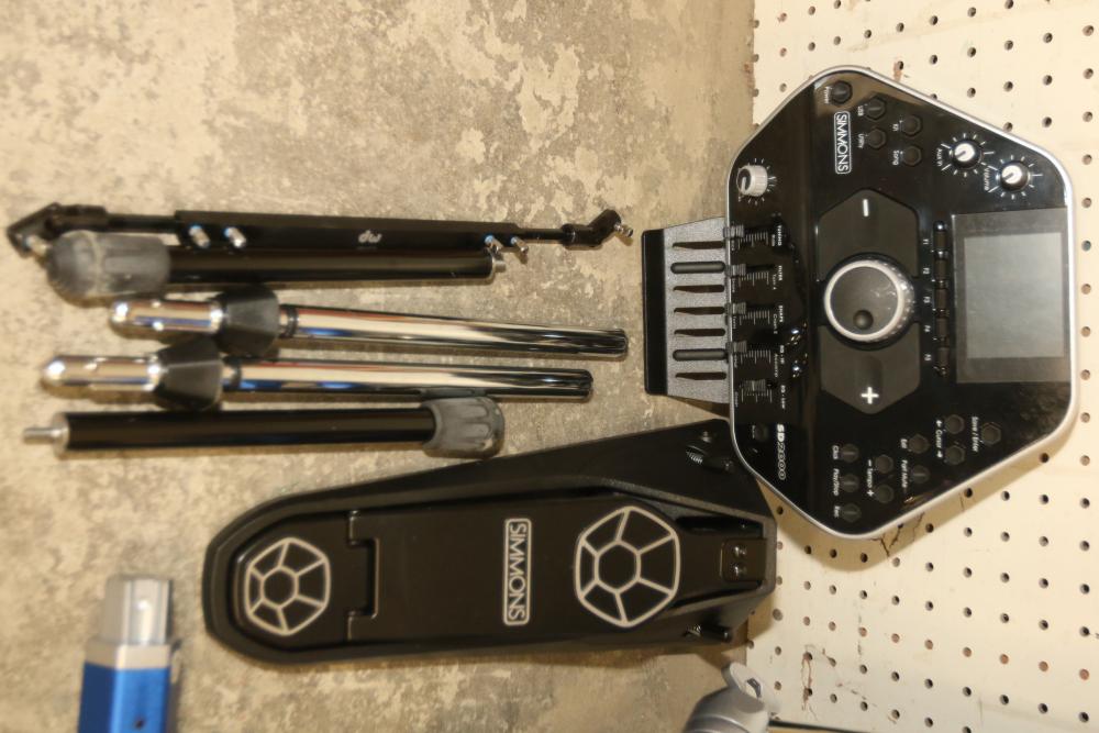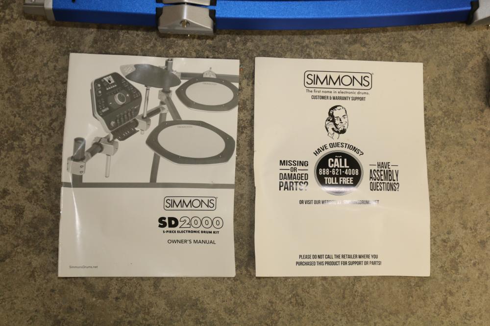 Simmons SD2000 Mesh Head Electronic Drum Kit featuring DW 7000 kick pedals, mesh drum pads, control module, cables, drumsticks, and assembly hardware. Includes the original owner's manual. The drum set is disassembled for transport. Pickup only.
