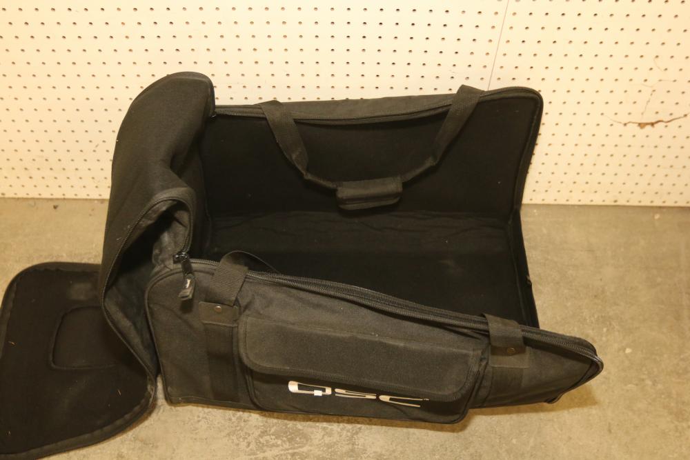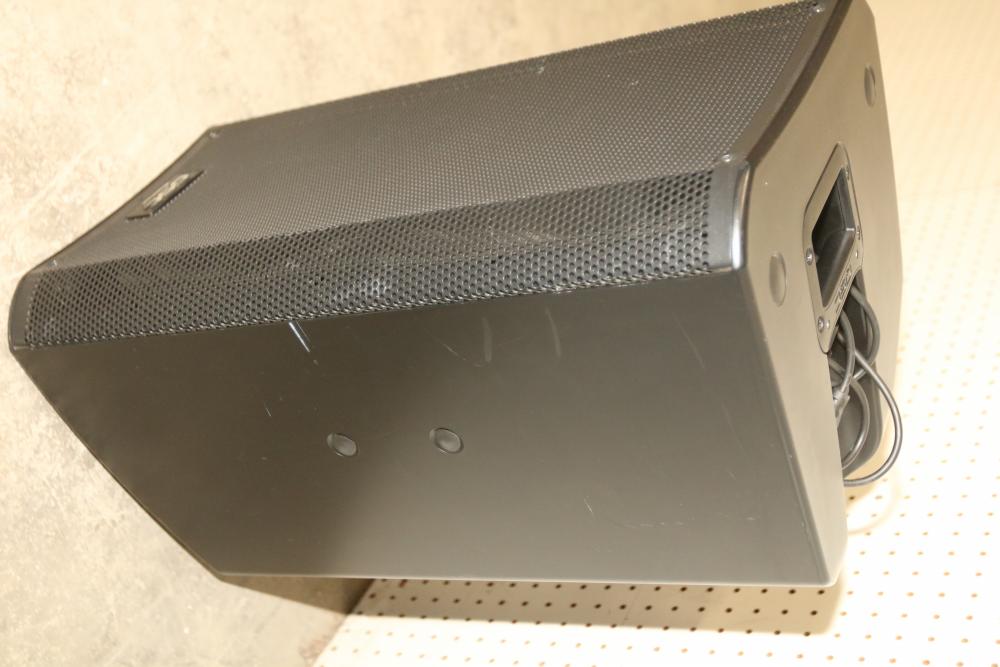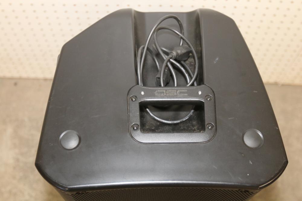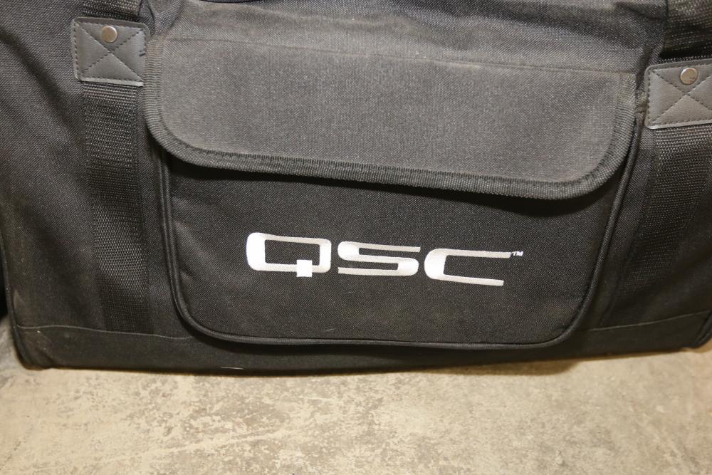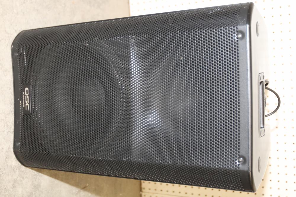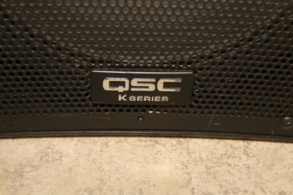 QSC K12 12 Inch 1 Kilowatt Powered PA Speaker with Carrying Case. Includes a powered 12-inch speaker capable of handling 1 kilowatt of power and a protective carrying case. The speaker has an integrated handle and input panel with various connectivity options for professional audio use. Pickup only.