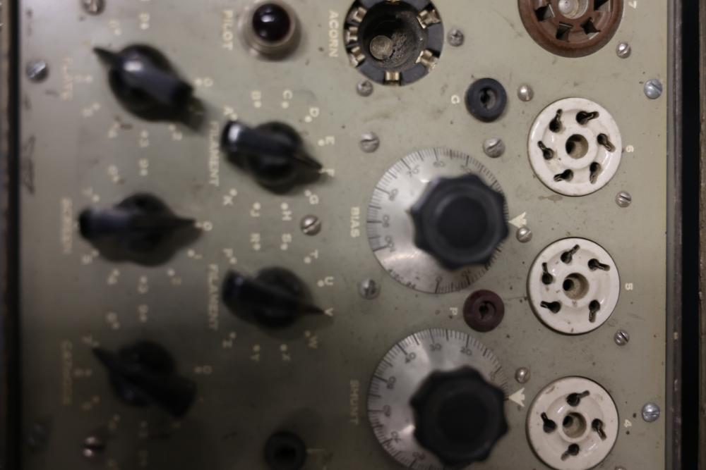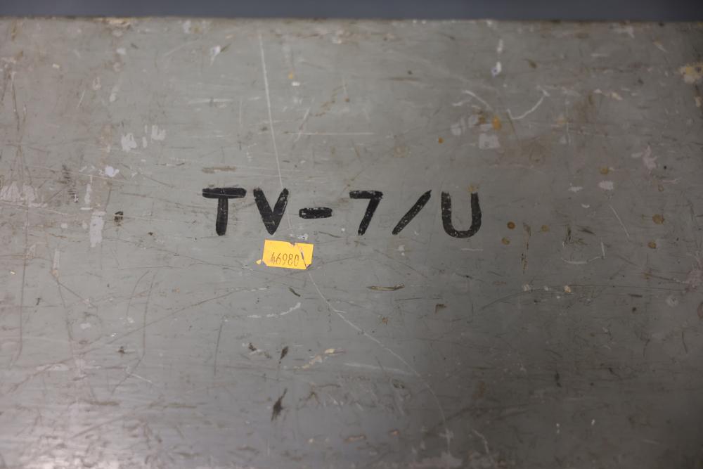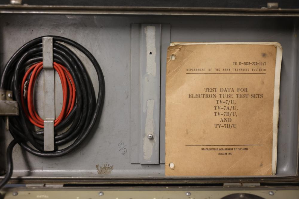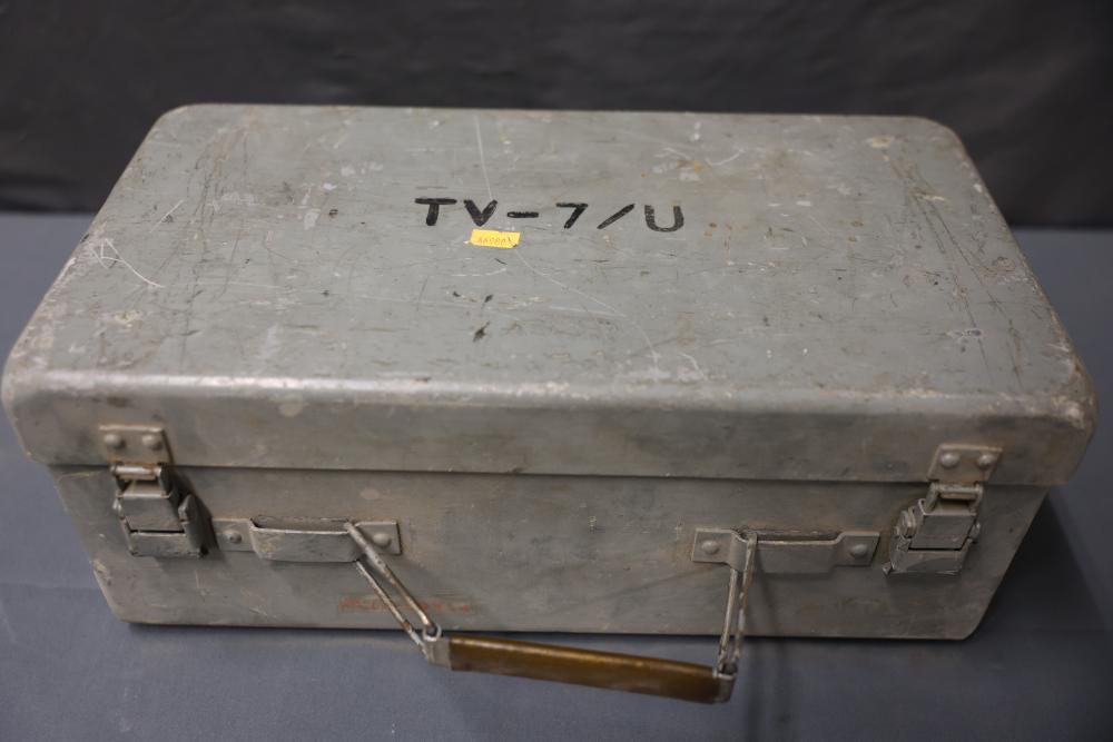 Vintage TV-7/U 33779-PH-53 Military Test Set Electron Tube Tester. This unit includes a metal carrying case, test data manual, power cord, and various connection points for electron tube testing. The outer case shows wear consistent with age and use. Pickup only.