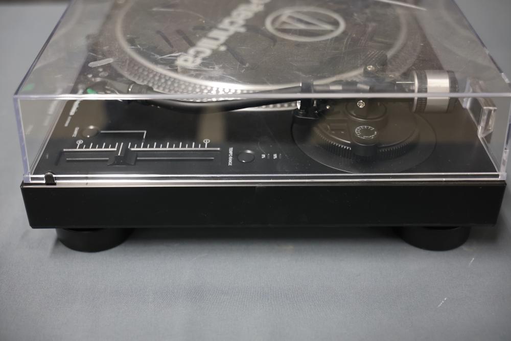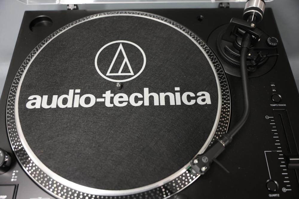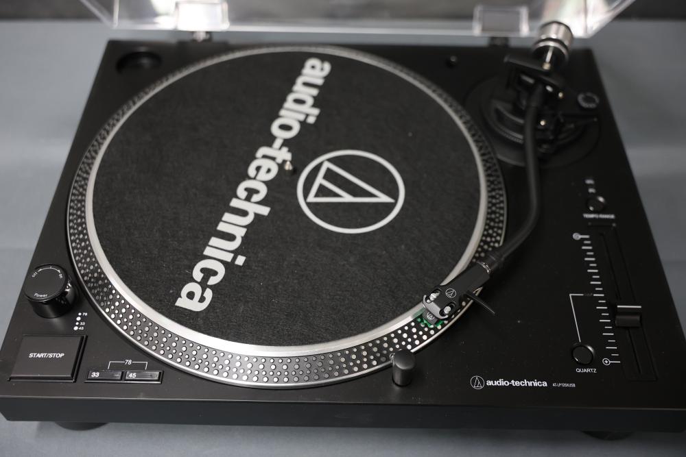 Audio-Technica AT-LP120XUSB Direct Drive DJ Turntable. Includes a power adapter and additional components as depicted. Unit features direct drive operation, quartz speed control, pitch adjustment slider, and support for 33, 45, and 78 RPM playback speeds. Dust cover is included. Pickup only.