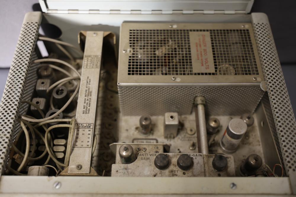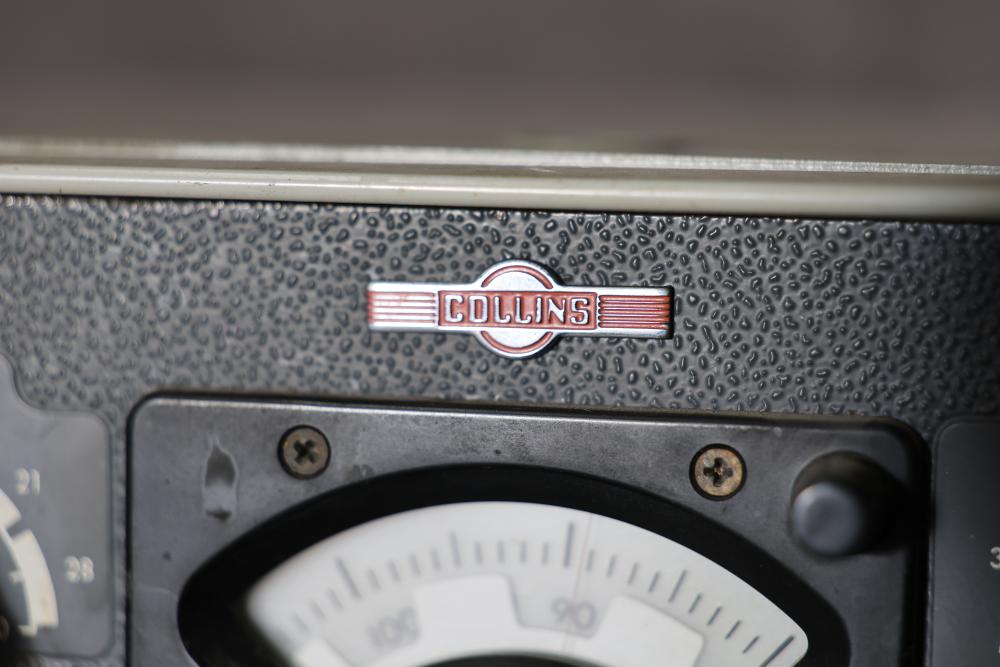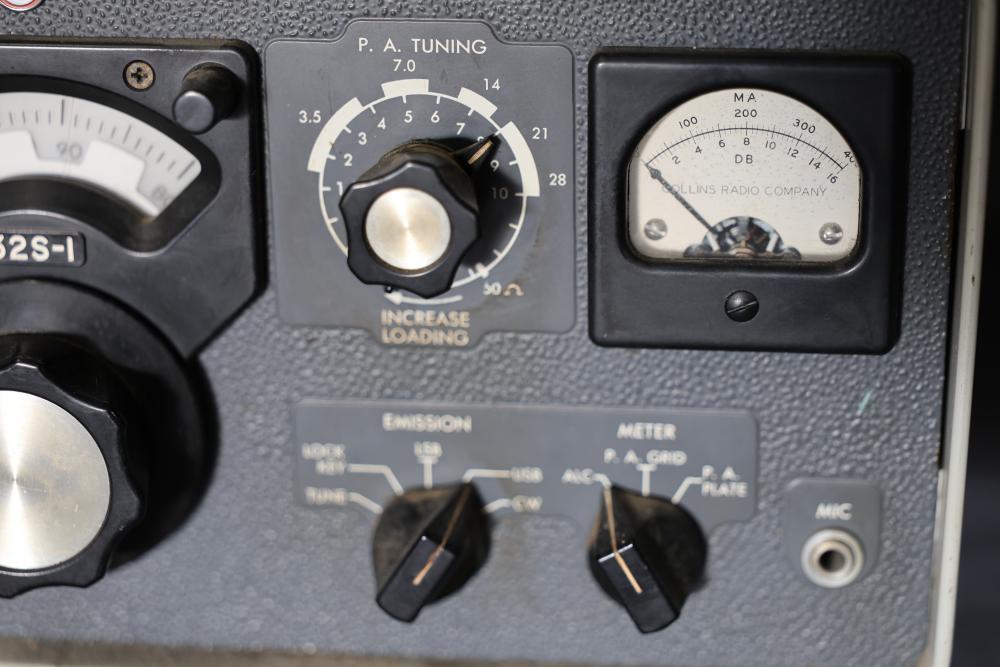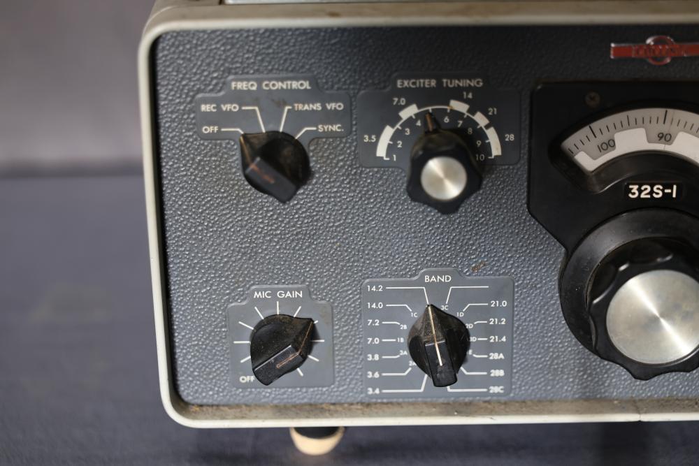 Collins 32S-1 Winged Emblem Vintage Ham Radio Transmitter. Includes the manual. Features a metal housing, various tuning and control dials, and connections on the rear panel. Displays the '32S-1' marking and Collins winged emblem on the front. Condition shows wear consistent with age and use. Pickup only.