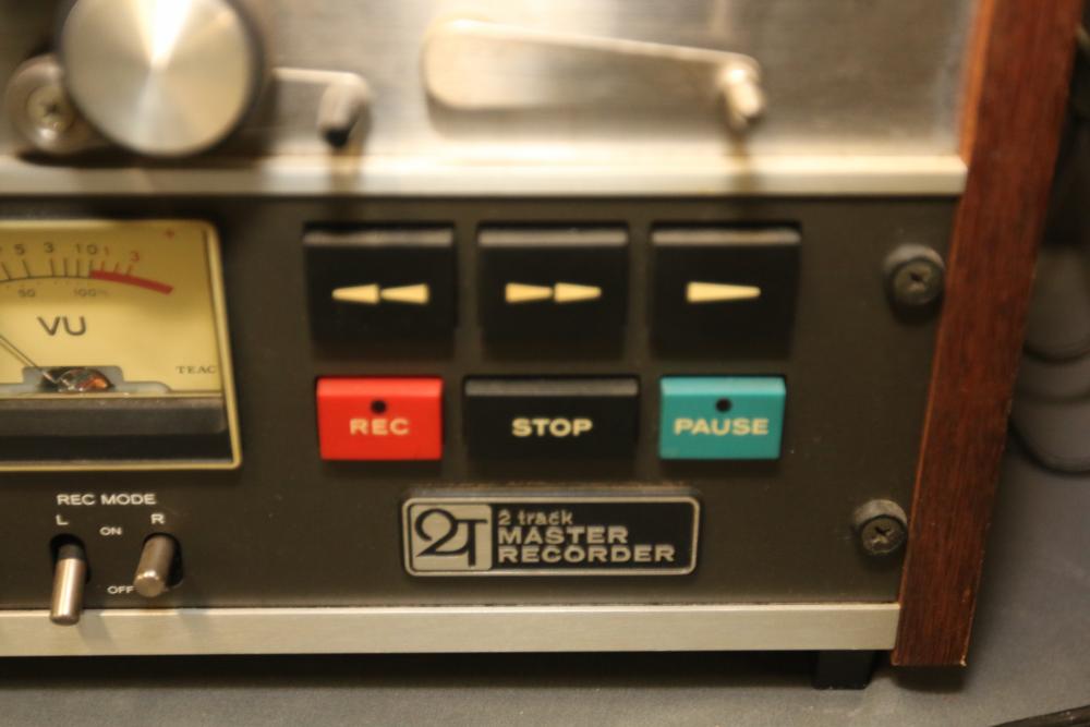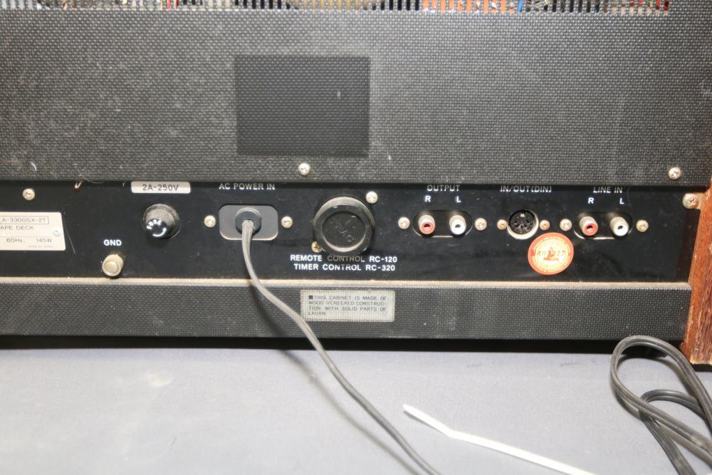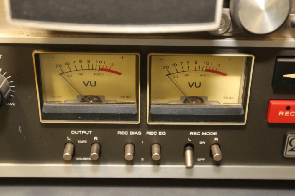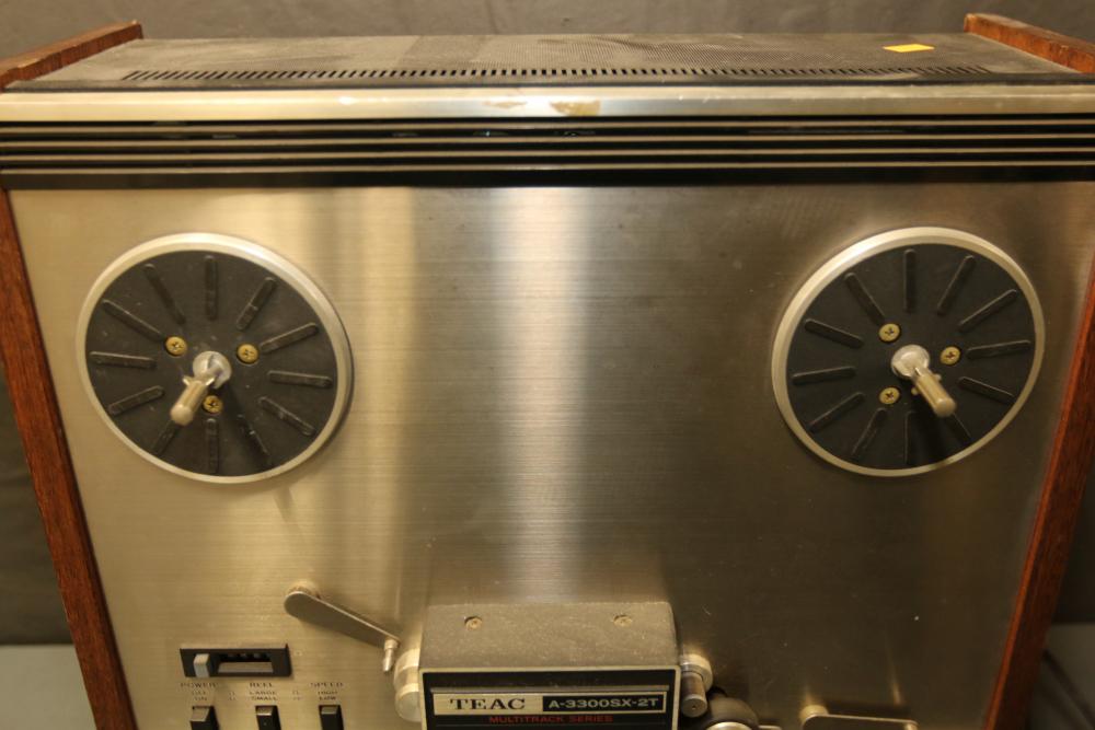 Teac A-3300SX-2T 10.5 Inch 4 Track Stereo Reel to Reel Tape Recorder with additional recording play tapes. Features include VU meters, mic, line, and output controls, and 2 track master recorder functionality. Comes with accessories including Scotch and Agfa recording tapes. Unit shows visible wear. Pickup only.