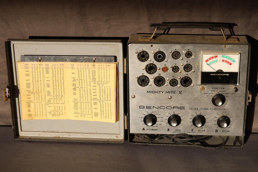 Vintage Sencore TC 142 Mighty Mite V Tube Checker. This device features a sturdy case with a handle, a variety of tube sockets, a meter for testing functionality, and controls for filament, load, and other settings. The inside lid includes a reference chart for tube testing. Pickup only.