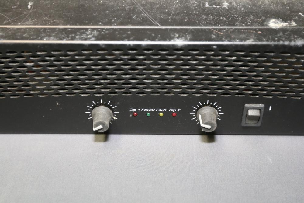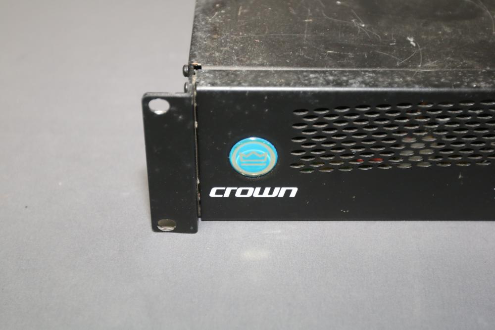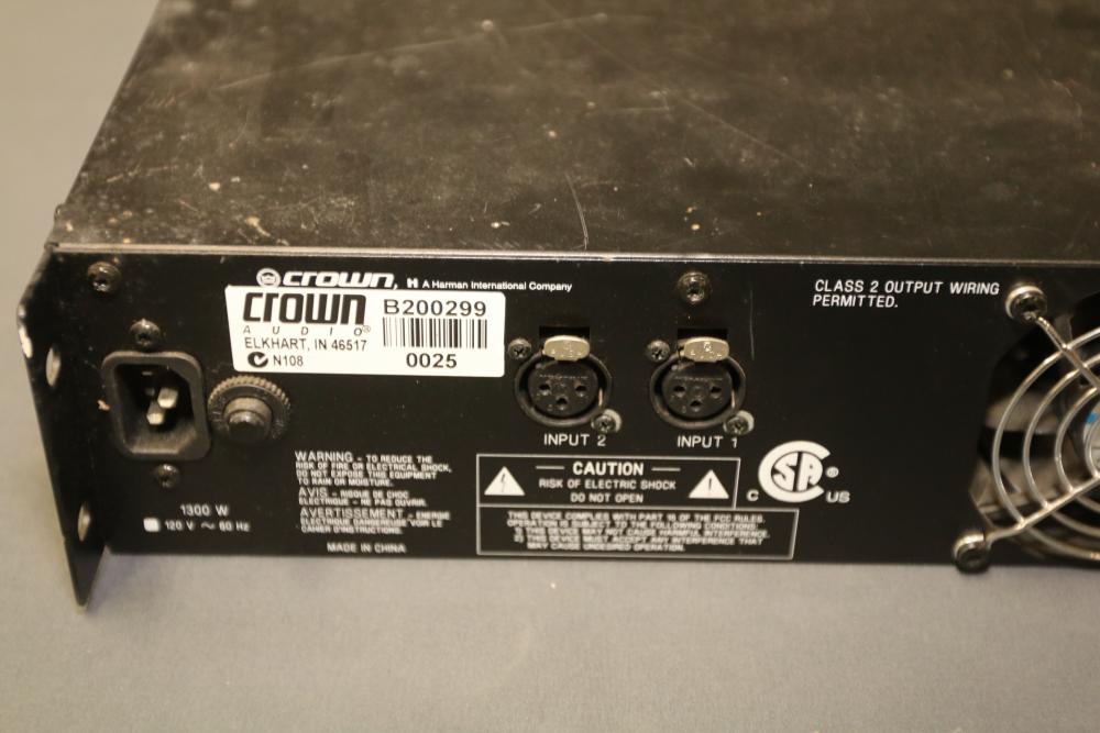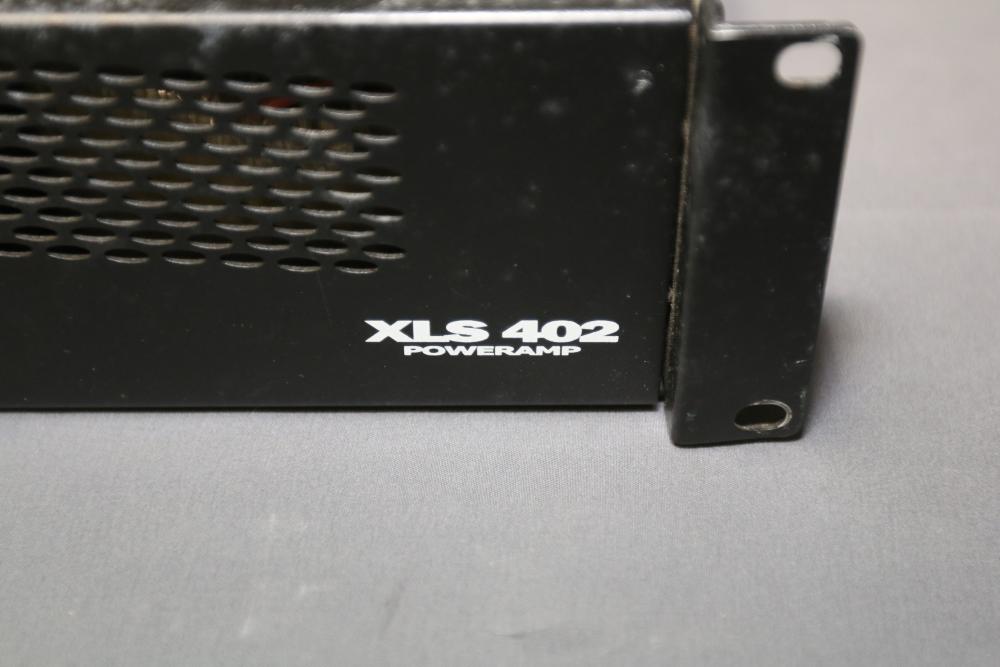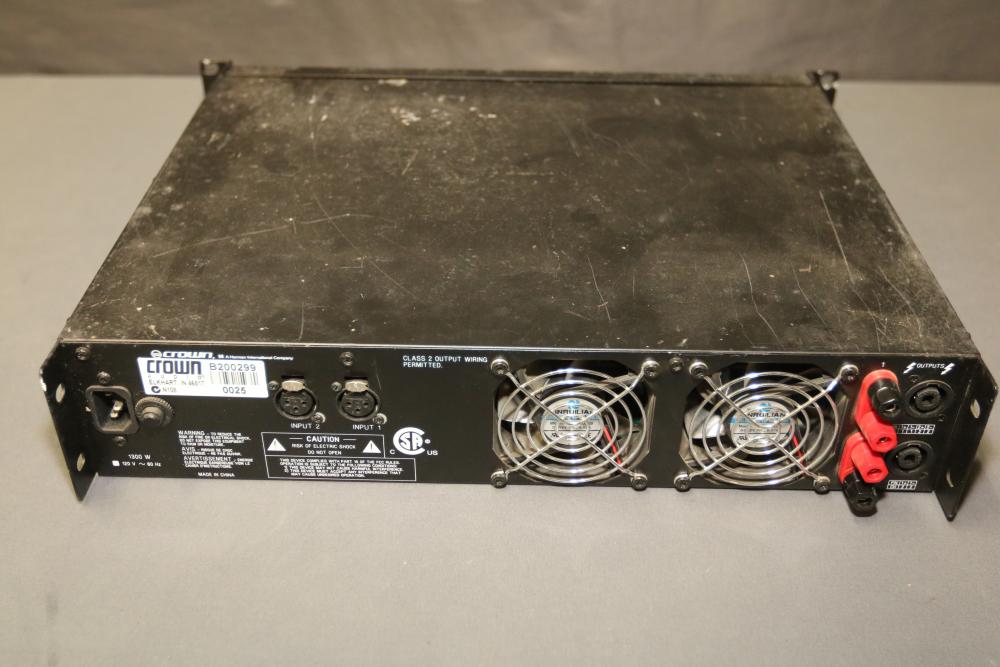 Crown XLS402 1300 Watt 2-Channel Power Amplifier. Features include two input connections, dual output connections, ventilation fans, and a power cable. The unit shows signs of wear and use, with visible surface scratches and scuffs. Fully functional hardware and control knobs are intact. Pickup only.