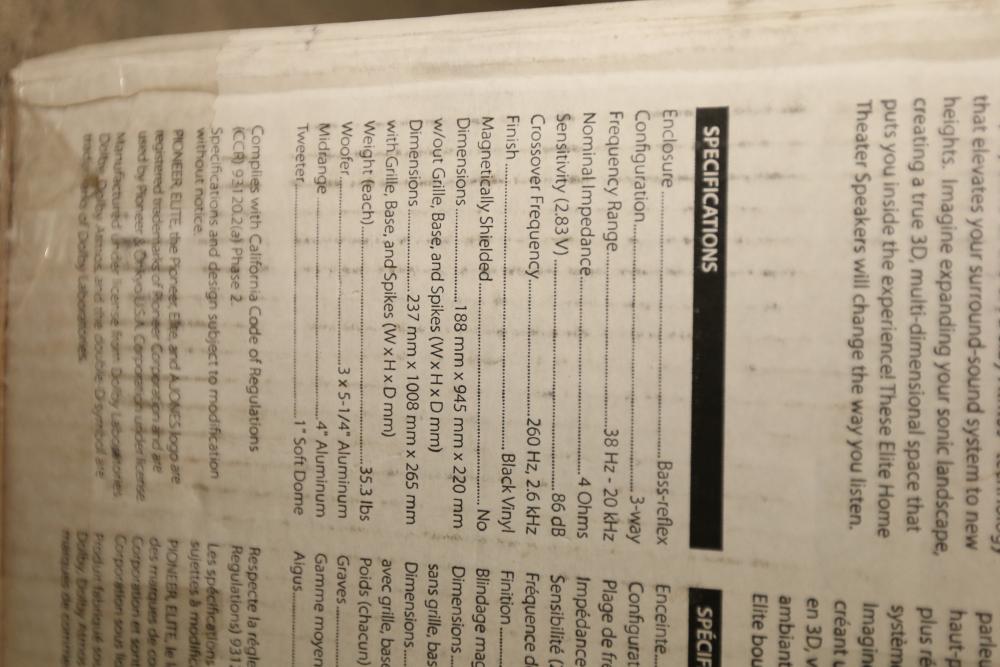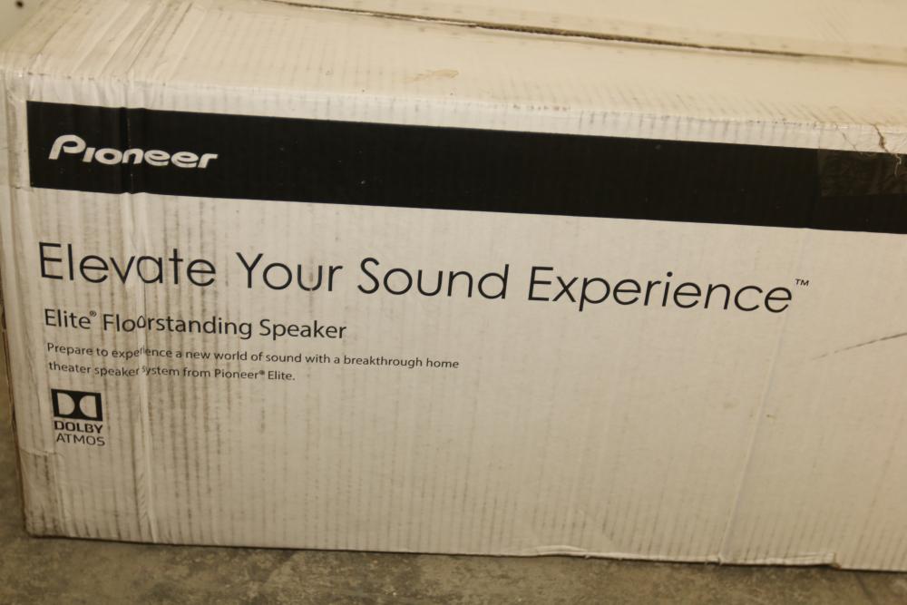 Pioneer Elite SP-EF573 Andrew Jones Home Audio Floor Standing Speaker. Designed for high-quality audio performance, this speaker features Dolby Atmos capabilities, a frequency range of 38Hz to 20kHz, and a nominal impedance of 4 Ohms. It measures 1010mm x 265mm x 198mm and weighs 35 lbs. The item comes in its original packaging. Pickup only.