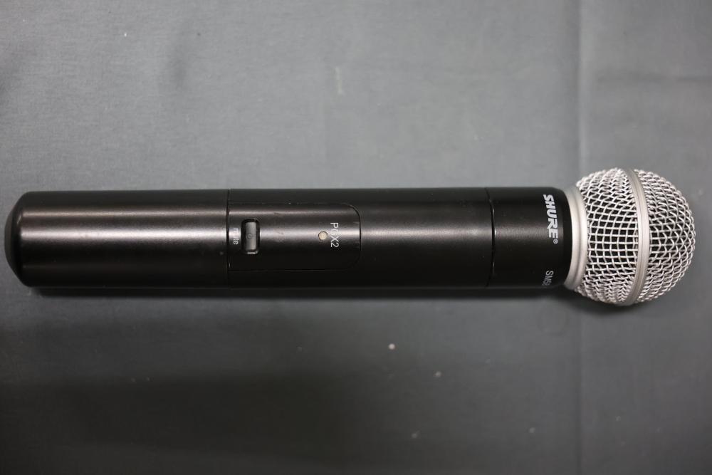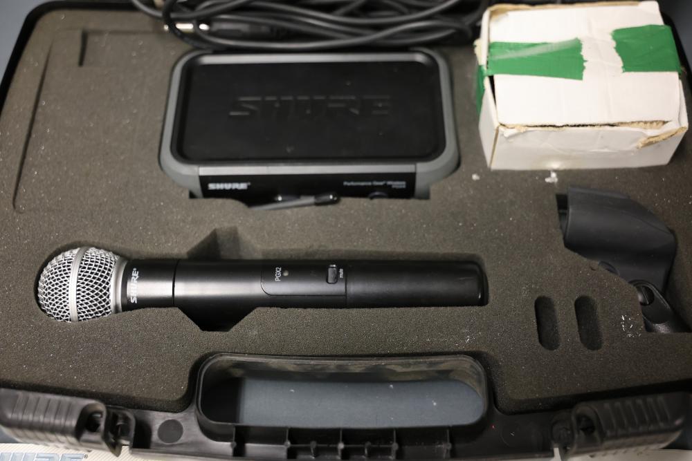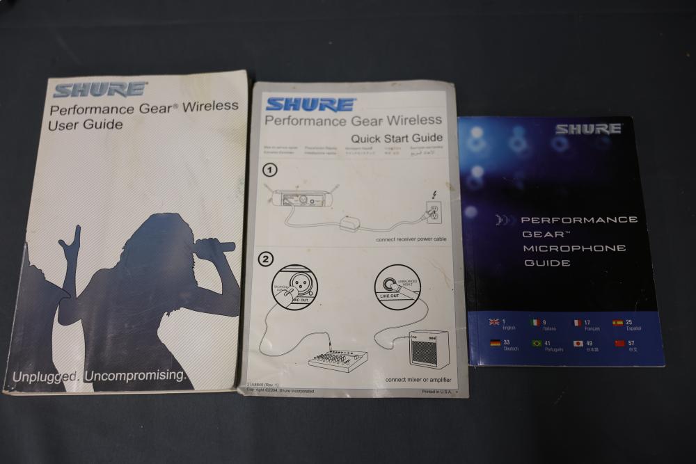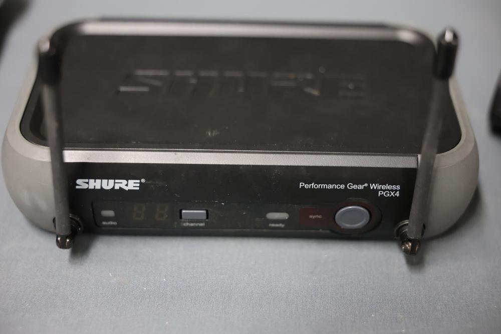 Shure PGX4 Receiver with Shure PGX2 Wireless Microphone includes microphone, receiver, power cable, microphone clip, user guides, and a carrying case. The receiver has outputs for mic and line connections and the wireless microphone features a mute switch. Light wear is visible on components. Pickup only.