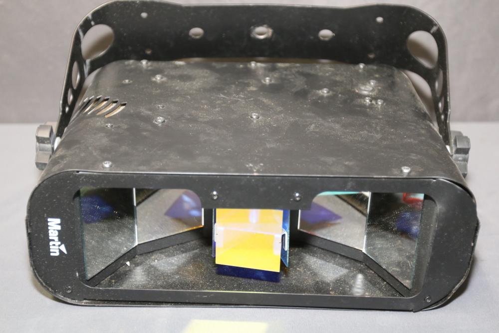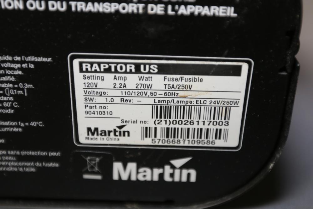 Martin RAPTOR DJ Effect Light. The unit features a durable housing, integrated mounting bracket, and power cord. Designed for producing dynamic lighting effects. Shows signs of use, including surface wear. Power specifications: 120V, 2.2A, 270W, with an ELC 24V/250W lamp. Pickup only.