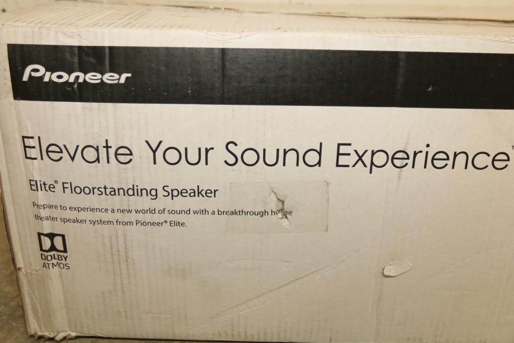 Pioneer Elite SP-EF573 Andrew Jones Home Audio Floor Standing Speaker. This speaker is designed to enhance the home audio experience with its advanced features and design by Andrew Jones. The speaker is packaged in its original box with protective materials. Pickup only.