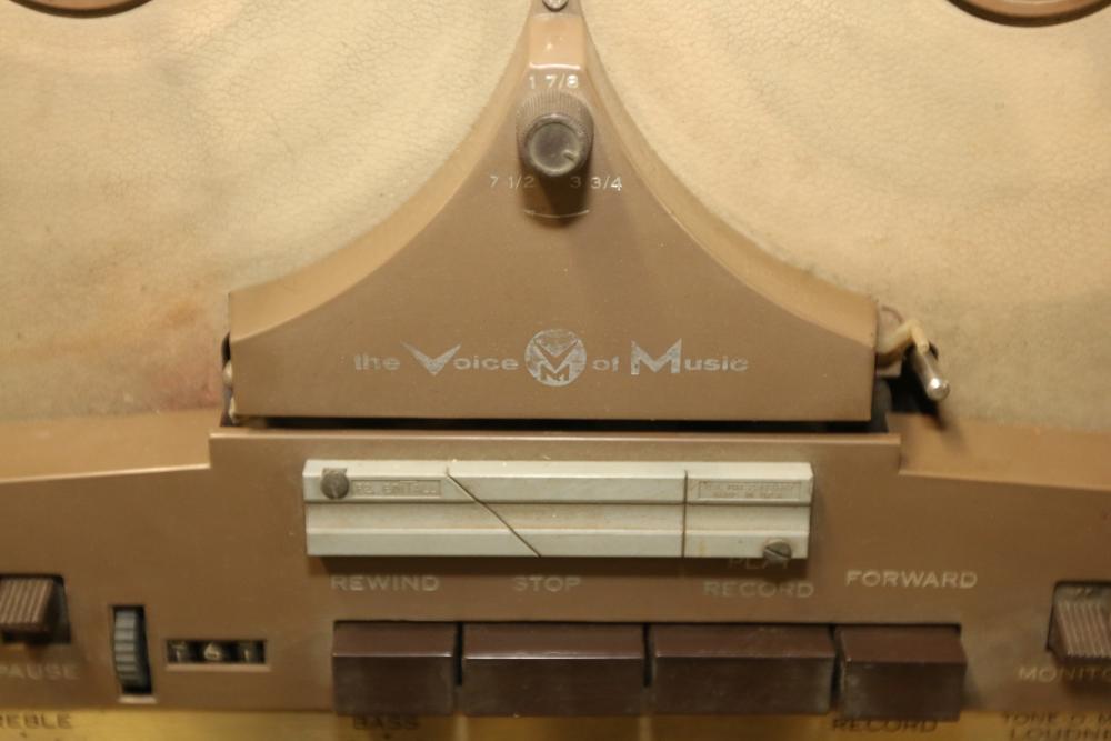 N/F Voice of Music Tape-O-Matic Model 730 Vintage Stereo Tube Reel to Reel Tape Deck. This tube-based reel-to-reel tape deck features playback, recording, and tone adjustment controls. The unit is currently not functioning. Pickup only.