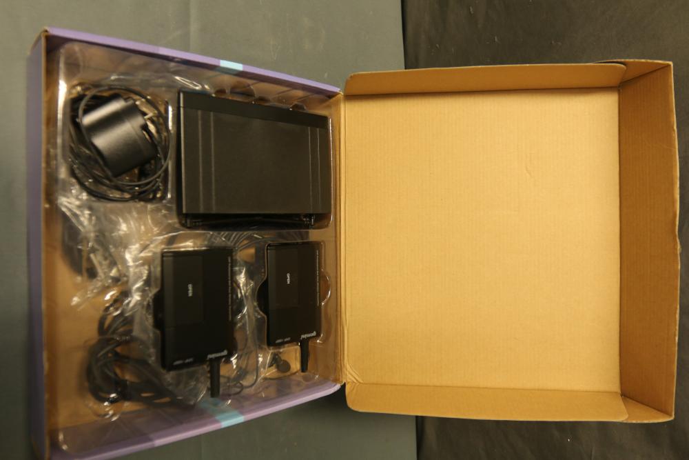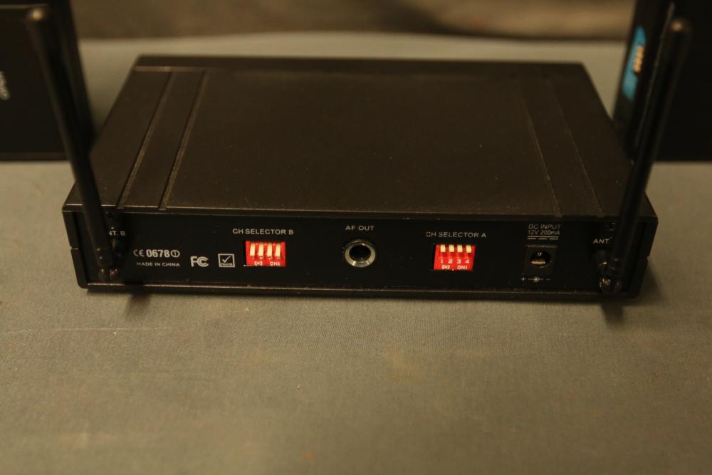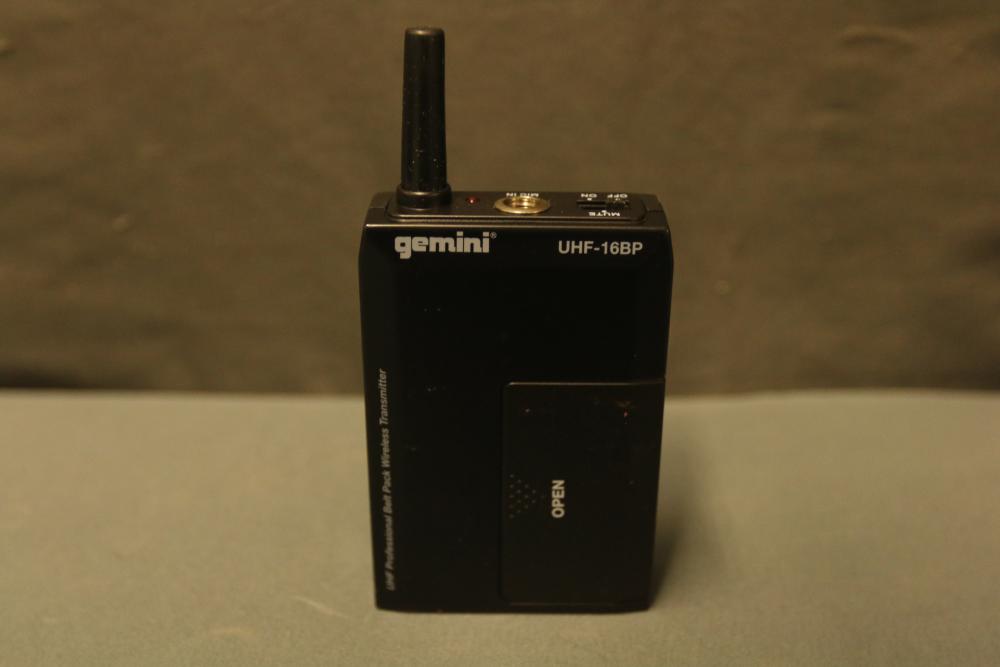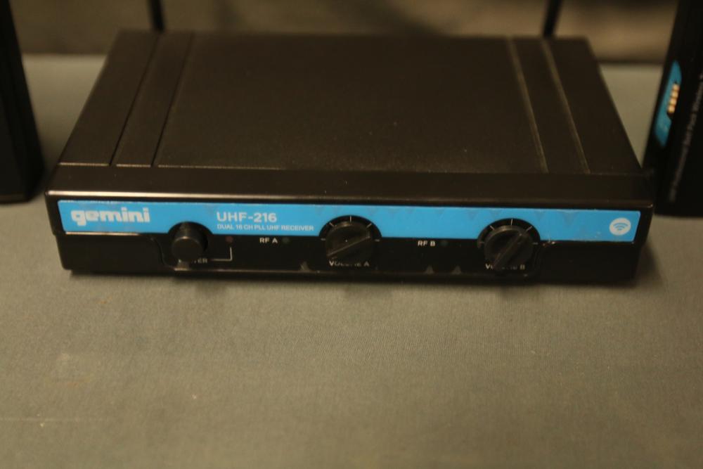 Gemini UHF-216HL Dual-16 Channel UHF Wireless System includes dual wireless receivers, body packs, and accessories. Features 250 foot operating range, interference protection, and options for up to 4 microphones. Includes cables, headsets, and power adapter. Pickup only.